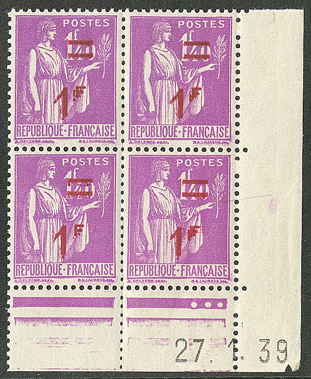 Double surcharge. No 484a, bloc de quatre cd 27.1.39, superbe. - R (cote Yvert : 7000€) (Image)
