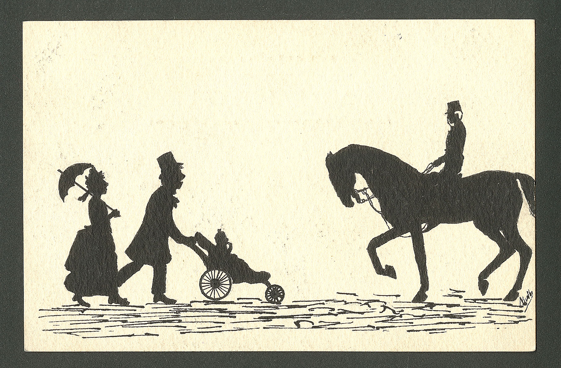 DIVERS.Lettre. Illustrations à la main. "Famille en promenande et cavalier". CP silhouette neuve, plume et encre de chine. - TB (Image)