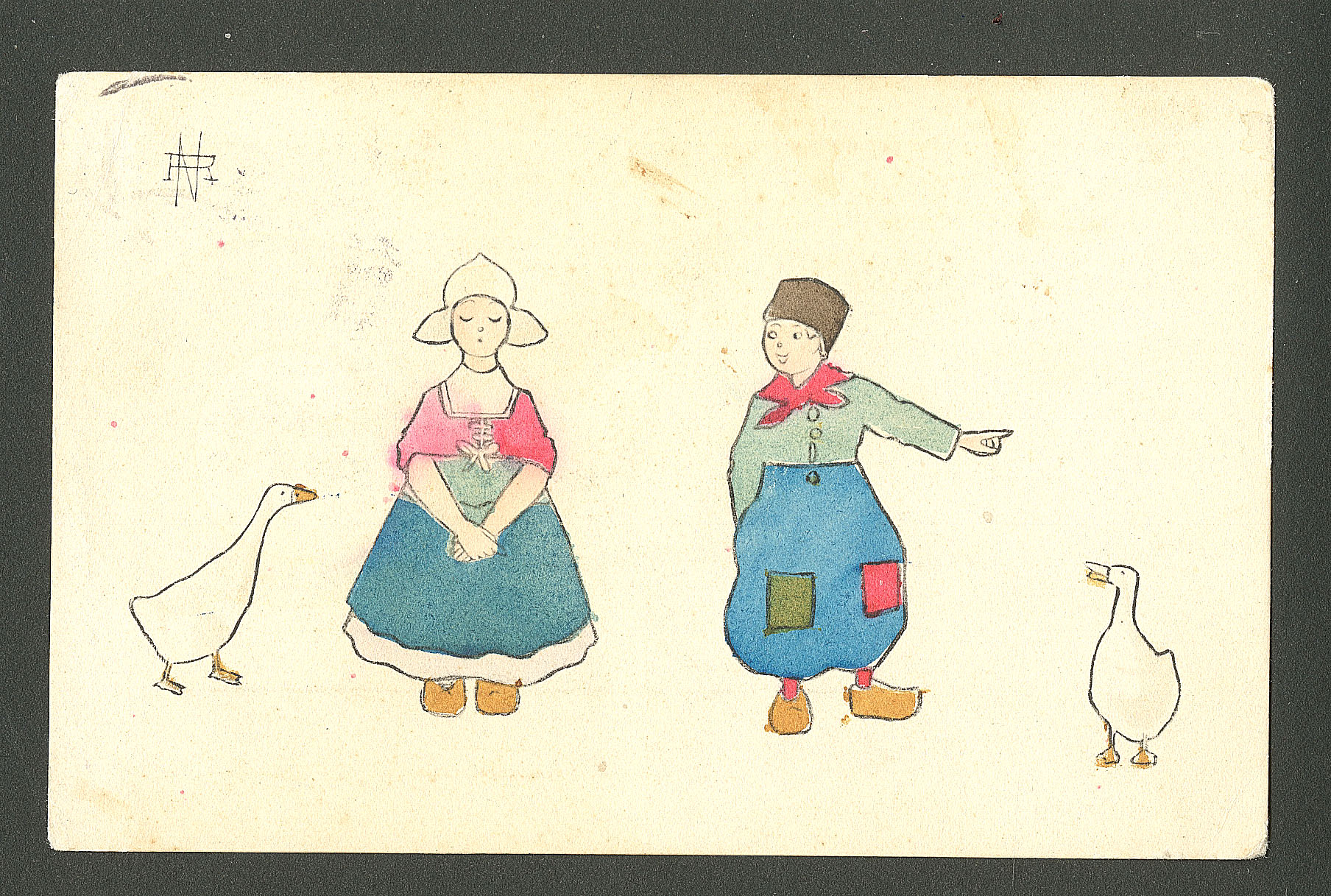 DIVERS.Lettre. Illustrations à la main. "Couple avec oies". CP voyagée, aquarelle et plume. - TB (Image)