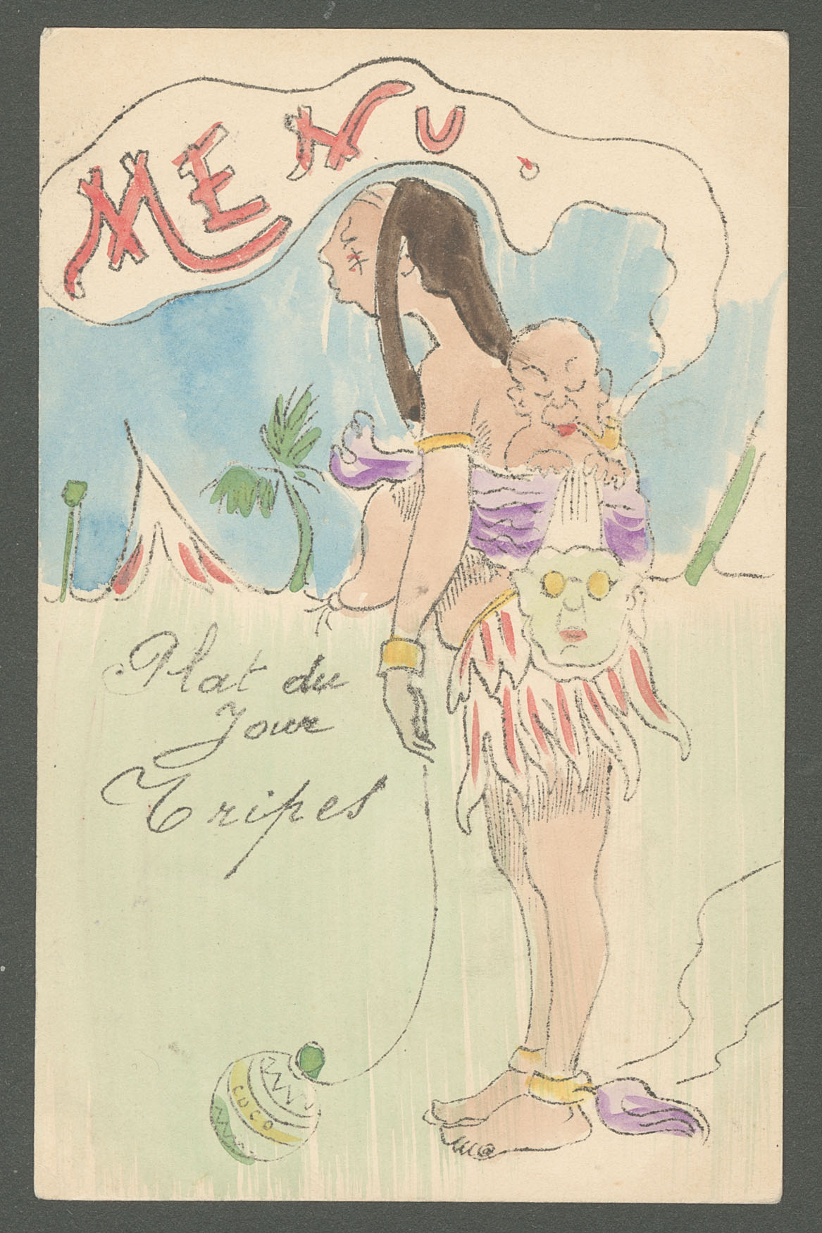 DIVERS.Lettre. Illustrations à la main. "Plat du jour, tripes". CP humoristique voyagée, aquarelle et plume. - TB (Image)