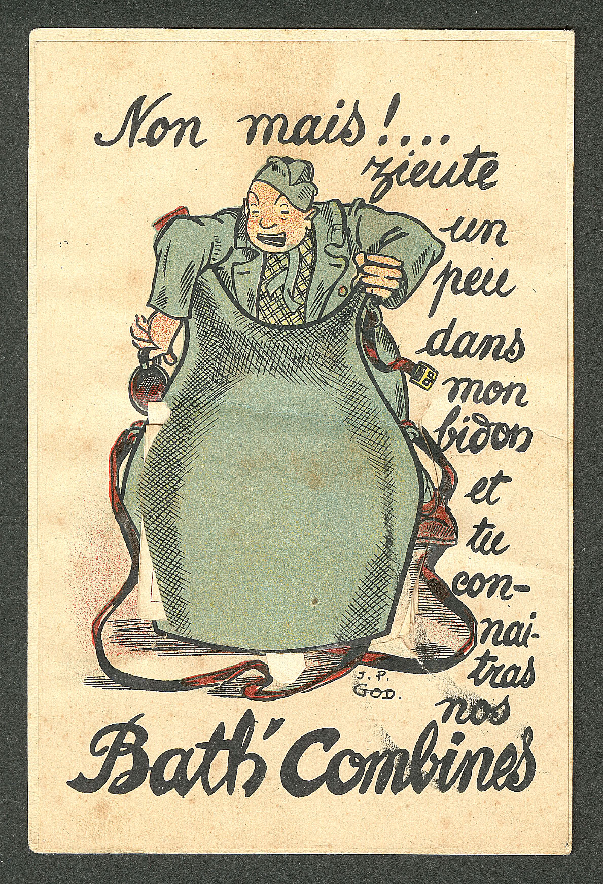 1356 c imageFRANCE. DOCUMENTS DIVERS.Lettre. CP militaire humoristique, avec dépliant "Nos bath' combines", signée "JP GOD", neuve. - TB (Image)