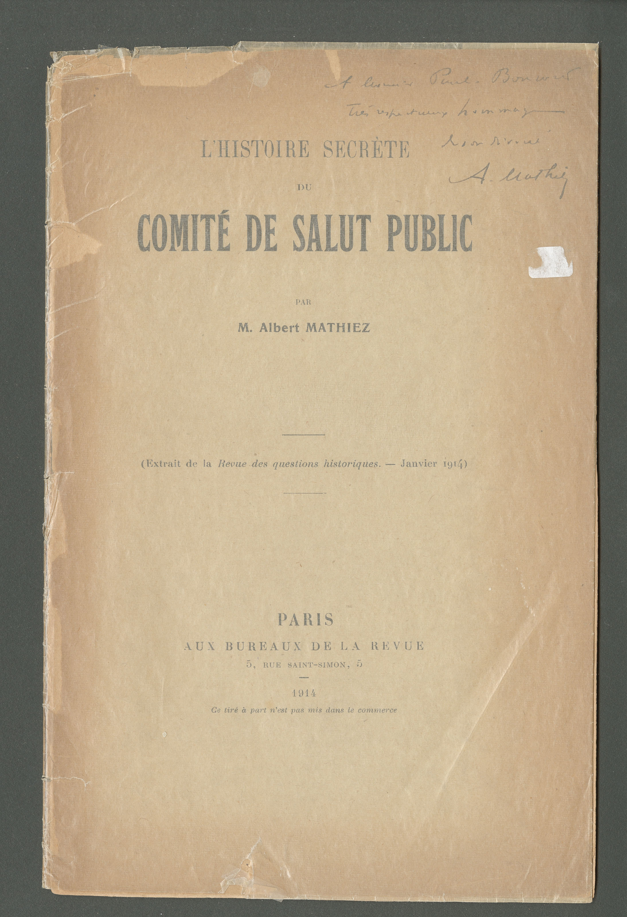 1362 imageFRANCE. DOCUMENTS DIVERS. Fascicule "Histoire secrète du comité de salut public", A. Mathiez Janv 1914, dédicacé, bon état général (Image) (Image2) (All Images)