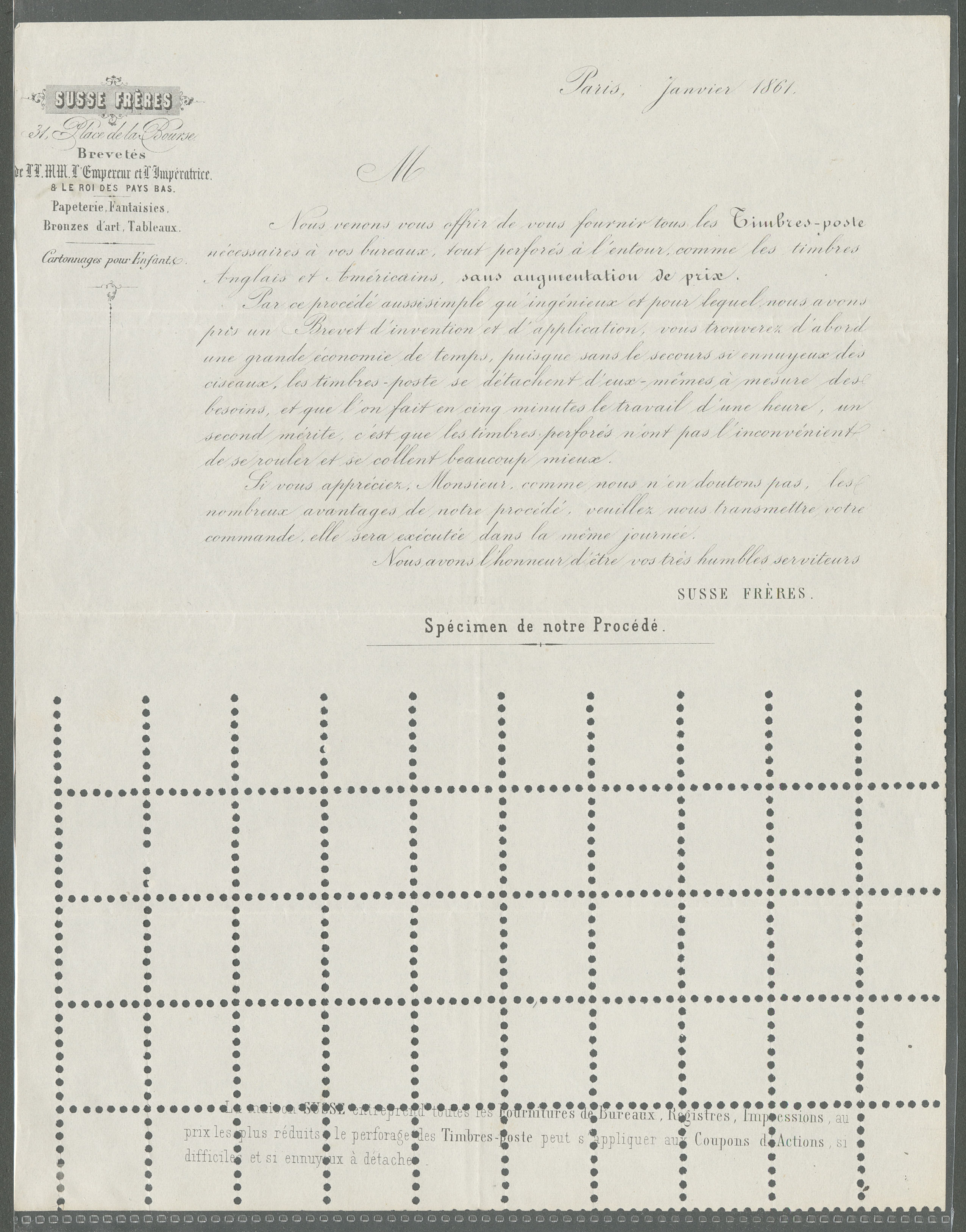 DENTELE.Lettre. Piquage Susse. Courrier à en tête "Susse Frères" proposant la fourniture de timbres perforés, avec modèle de la perforation. - TB (Image)