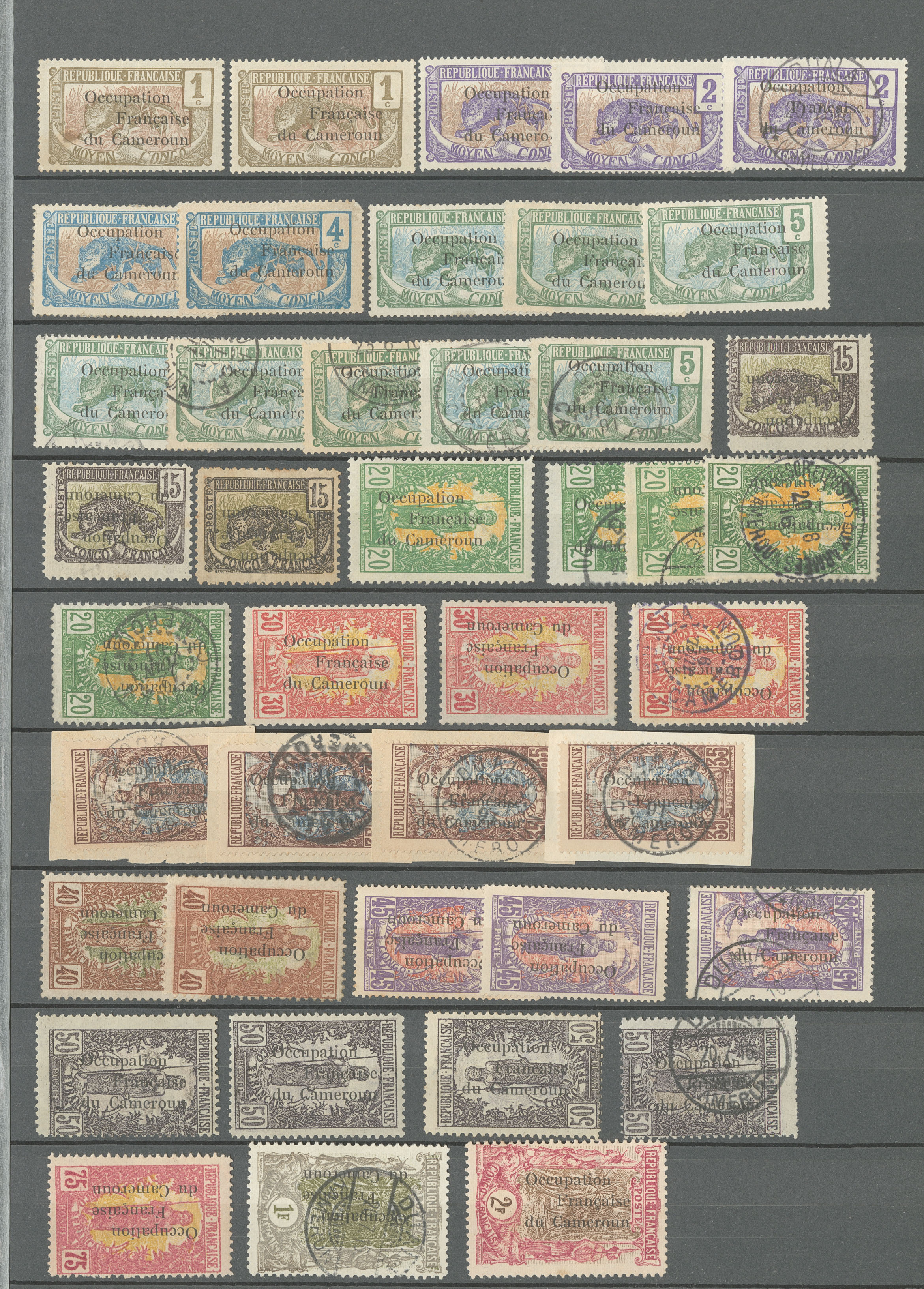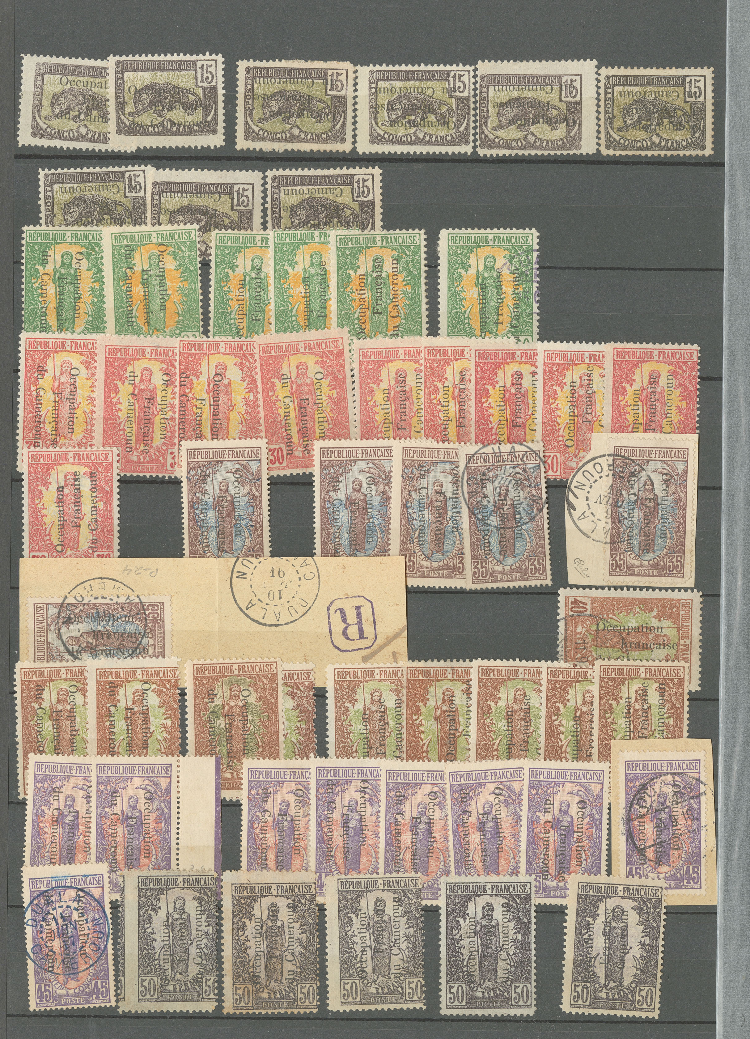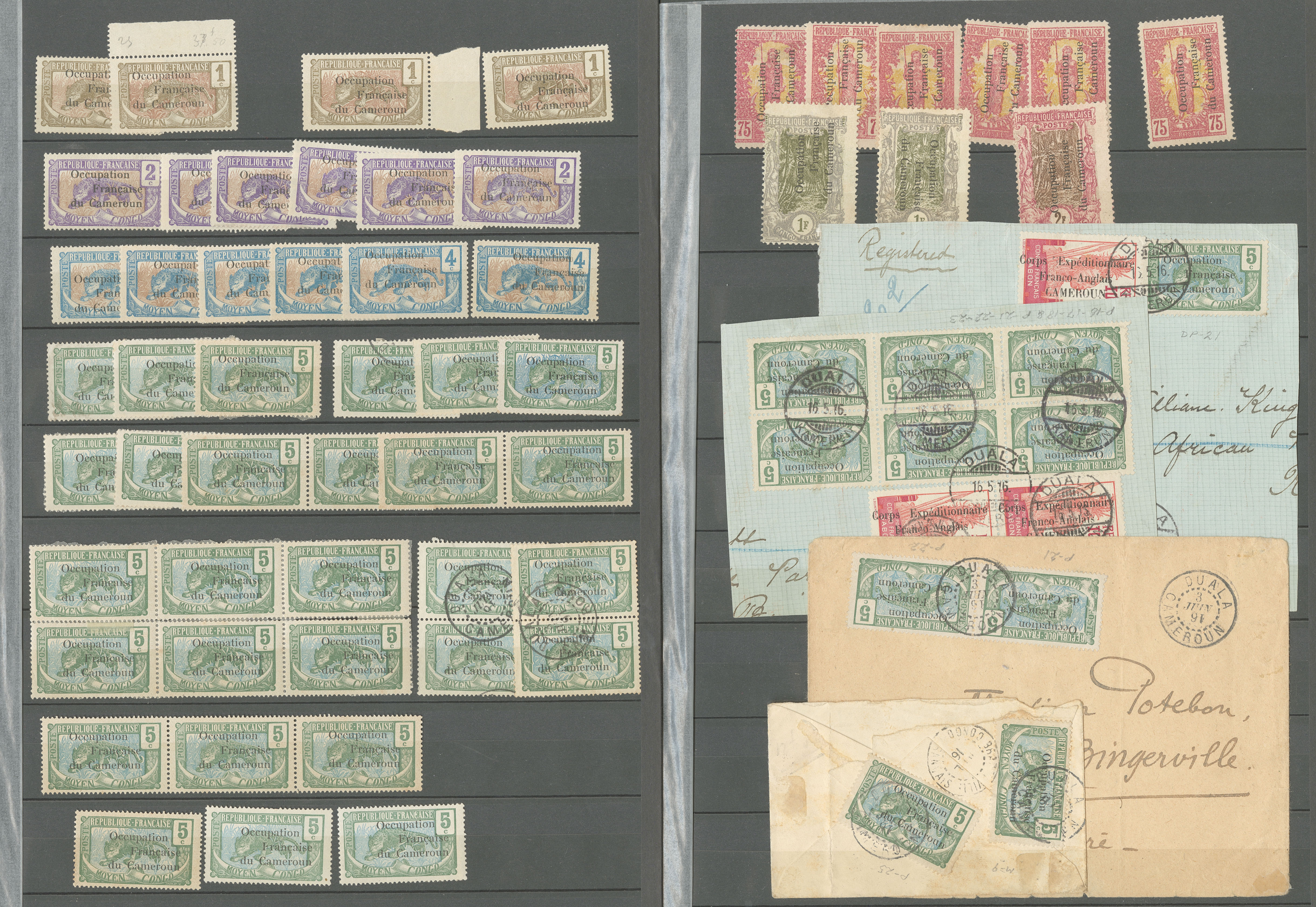 CAMEROUN. * Occupation française. Nos 53 à 66, par multiples de 2 à 8 dont variétés, surcharge ascendante, double surcharge, filigrane inversé, des ex (*) et obl. - TB (cote Yvert : 5400€) (Image)