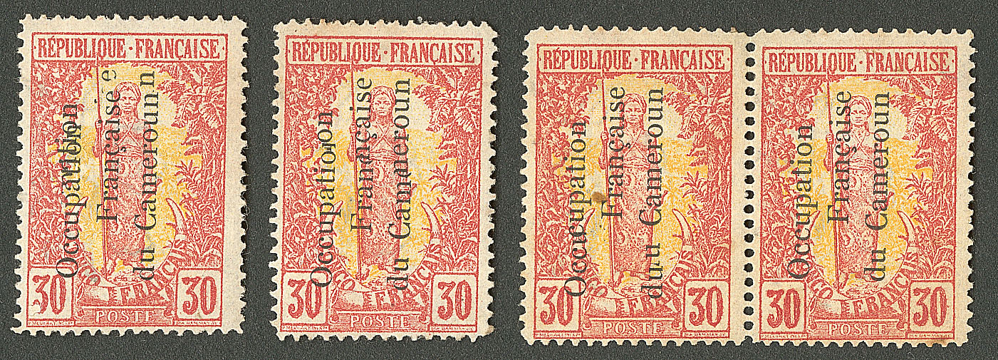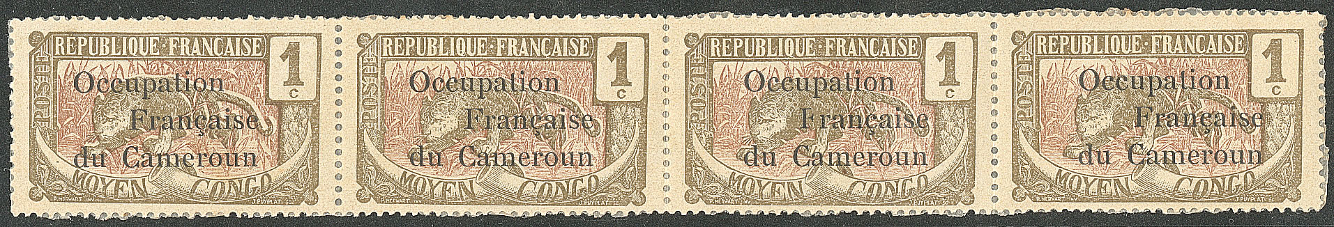 CAMEROUN. (*) Occupation française. No 59, 4 ex provenant d'une même bande de quatre, avec surcharge tronquée et partiellement doublée, pos. 71 à 74, pièce unique. - TB. - R