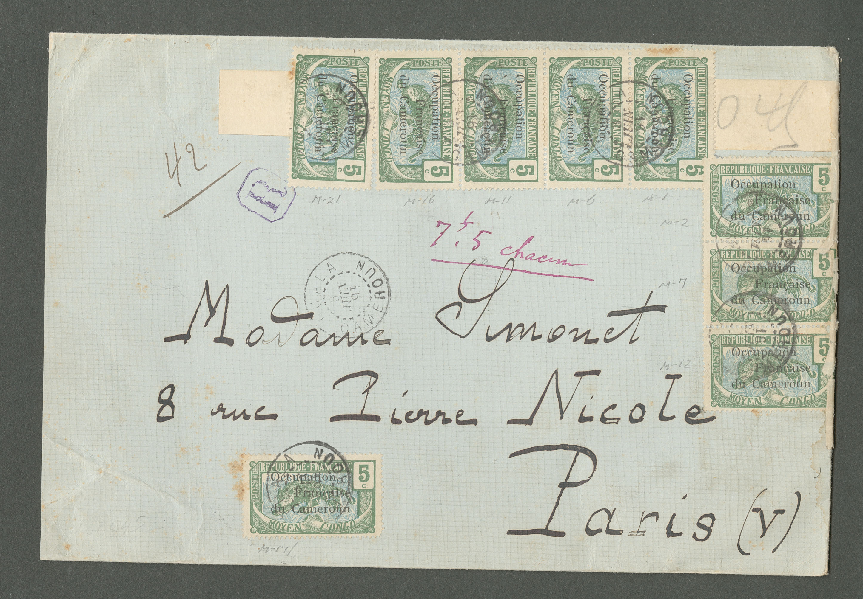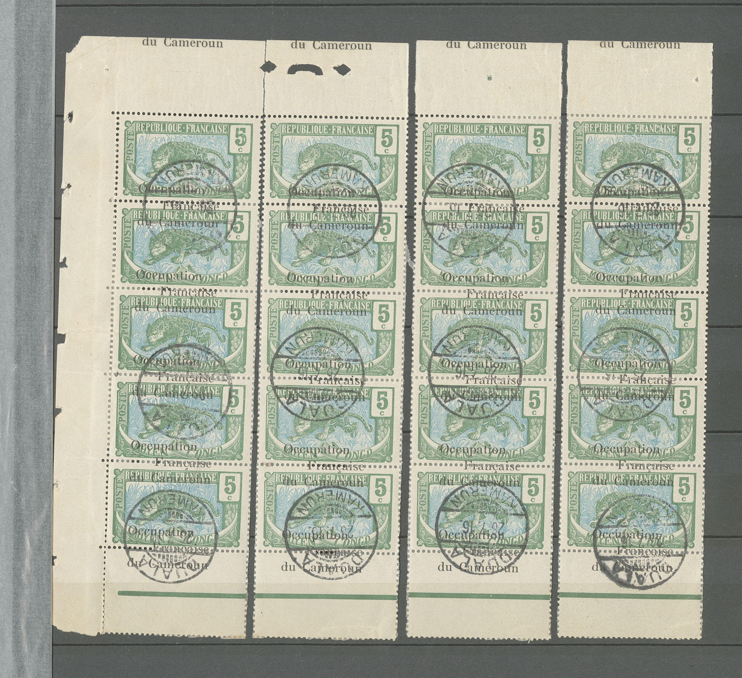 CAMEROUN. * Occupation française. Surcharge décalée vers le bas. No 56, 4 bande de cinq verticales issues du même panneau de 25 ex, obl 26. 7.16, pos. 1-4, 6-9, 11-14, 16-19 et 21-24, avec papier paraffiné au verso, ensemble unique. - TB (Image)