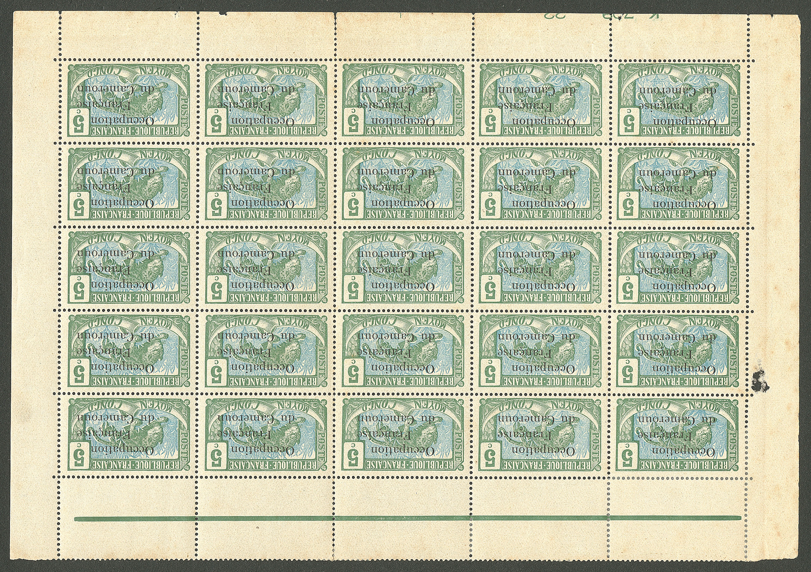 CAMEROUN. * Occupation française. No 56, panneau de 25 ex et seul exemplaire connu avec surcharges P1 à P25, gomme coloniale. - TB (Image)