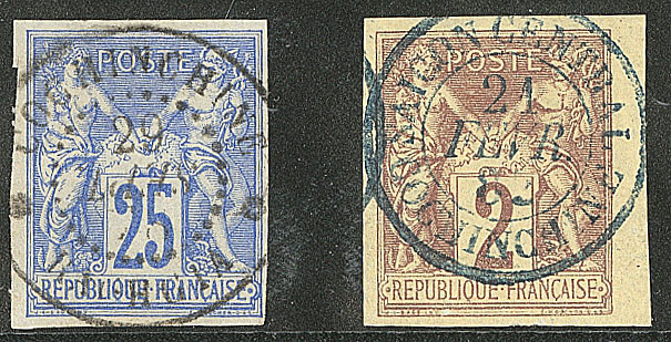 COCHINCHINE. Précurseurs. CG 36 obl cad "Rachjia" et 38 obl Saïgon central en bleu. - TB (cote Yvert : 520€) (Image)