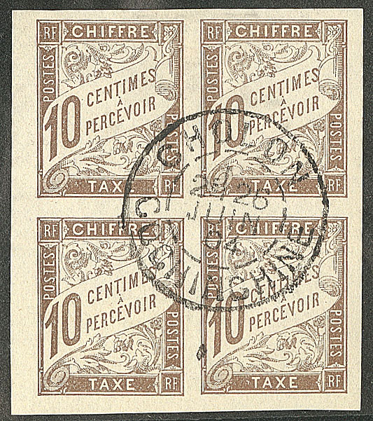 COCHINCHINE. Précurseurs. Taxe. CG 19, bloc de quatre cdf obl cad central "Cholon", superbe (Image)