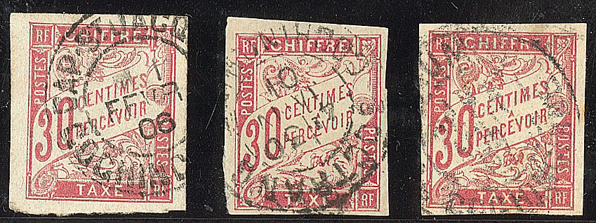 COCHINCHINE. Précurseurs. Taxe. CG 22, 3 ex obl Cap St Jacques, Soctrang et Thudaumot. - TB (Image)