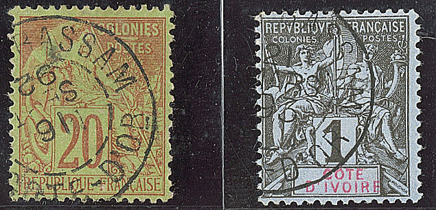 COTE-D'IVOIRE. Précurseurs. CG 52 et Poste 1, obl cad "Grand Bassam Côte d'Or". - TB (Image)