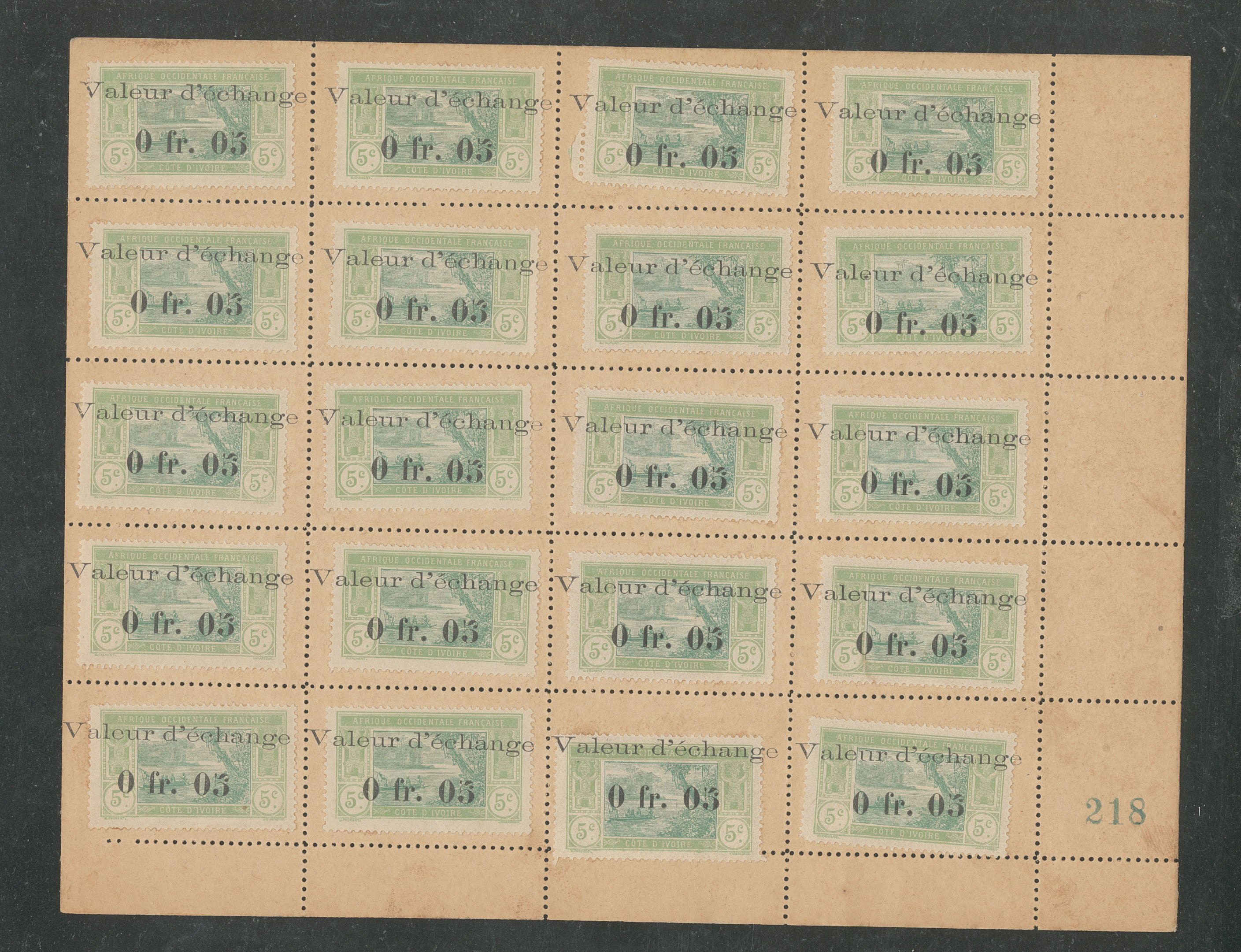 COTE-D'IVOIRE. (*) Timbre-Monnaie. Poste 44, surchargé "Valeur d'échange 0fr05", feuille complète de 20 ex avec N° 218. - TB (Image)