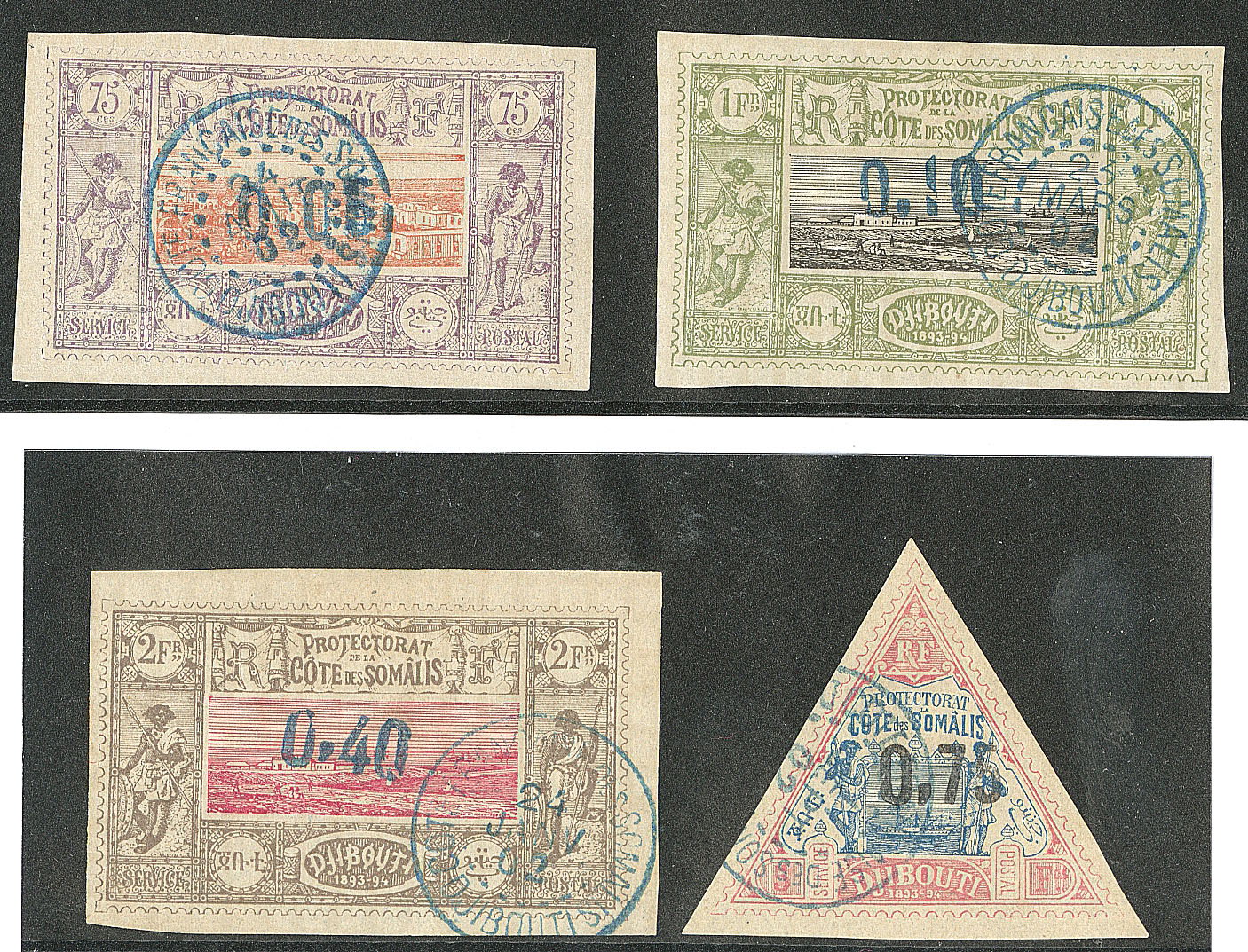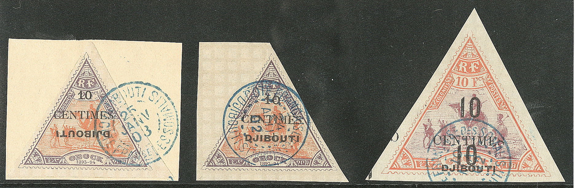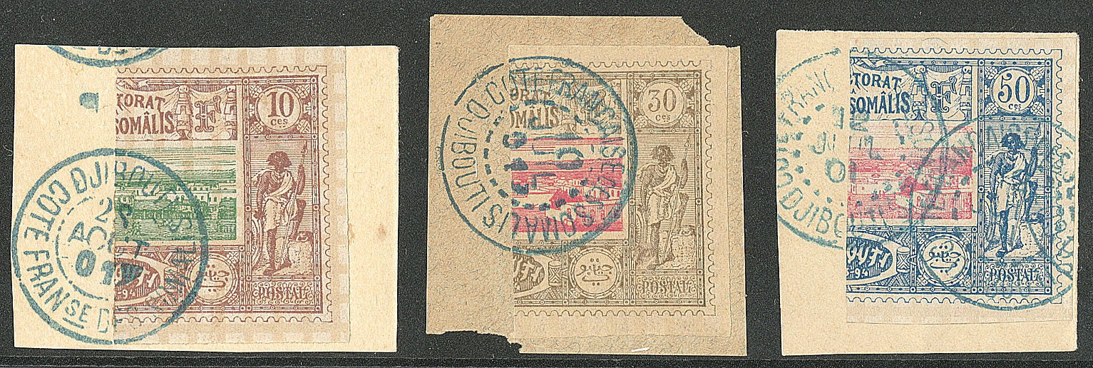 COTE FRANÇAISE DES SOMALIS. Coupés. Nos 10C, 13C, 15C, sur 3 petits fragments. - TB (cote Yvert : 535€) (Image)
