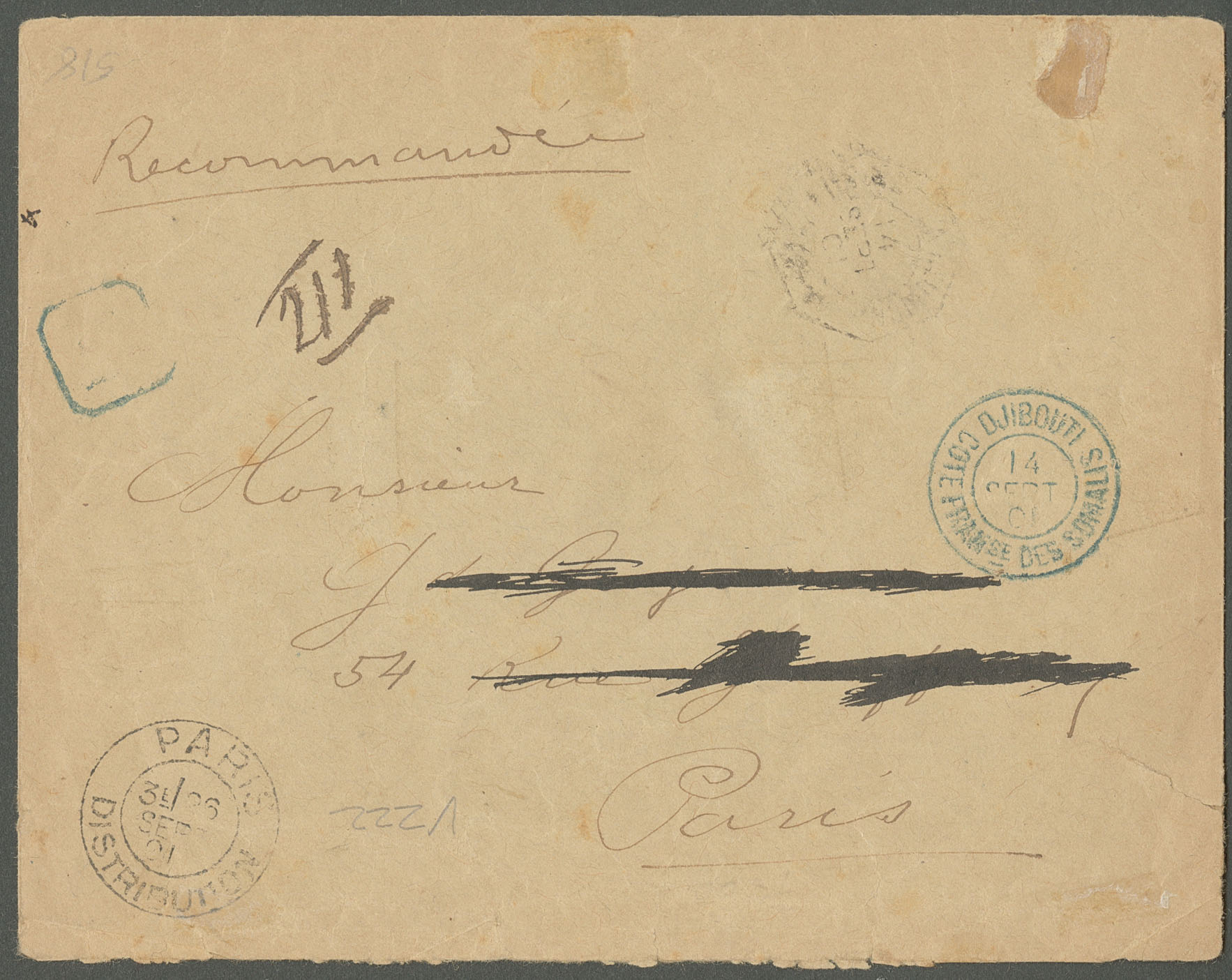 COTE FRANÇAISE DES SOMALIS. Lettre. Coupés. Nos 10ca + 13ca + 14b, sur enveloppe recommandée de sept 1901 pour Paris. - TB (Image) (Image2)