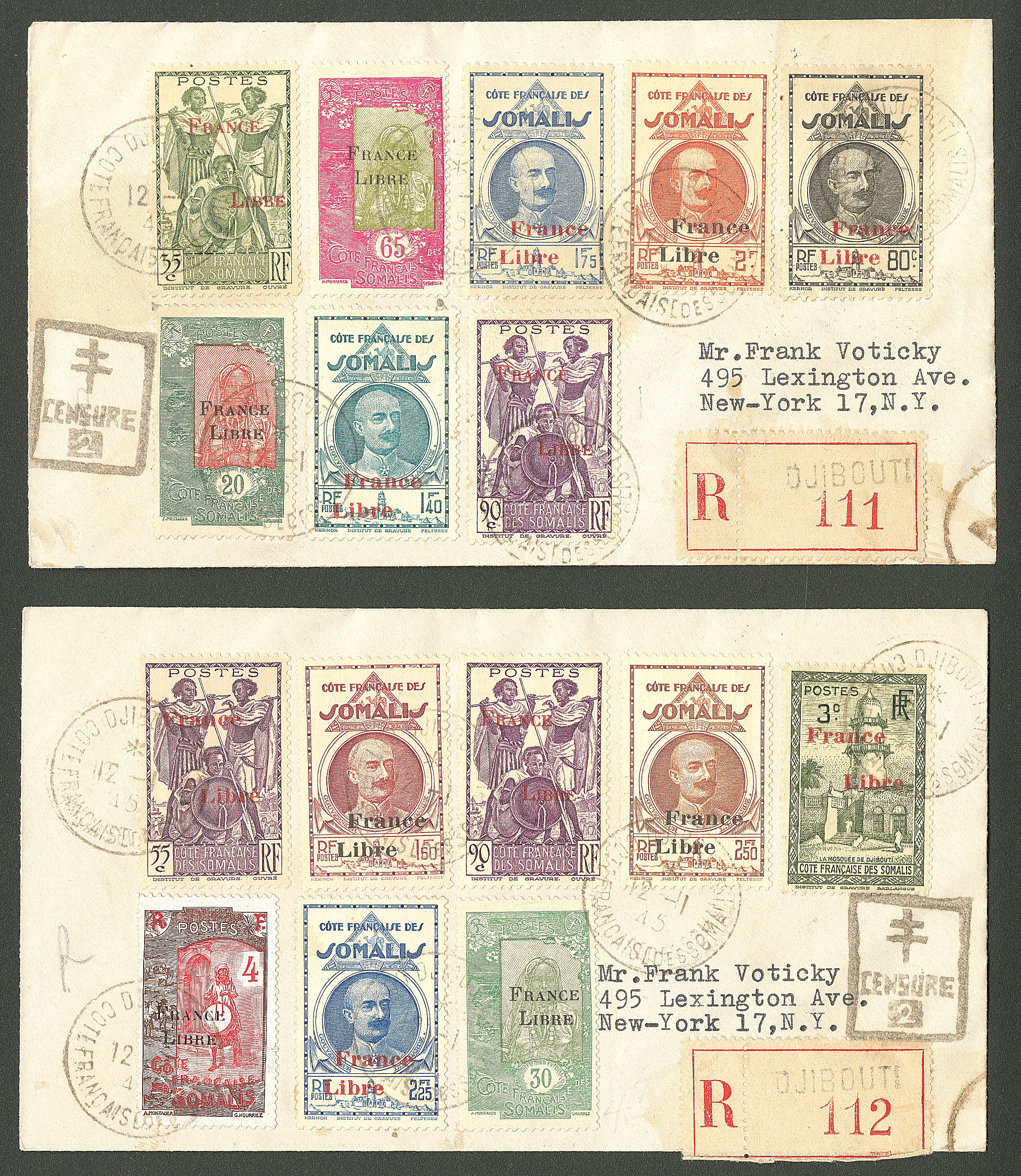 COTE FRANÇAISE DES SOMALIS. Lettre. France-Libre. Nos 195 + 198 + 199 + 201 + 205 + 213 + 216 + 219 + 220(2) + 222 + 224 à 228, sur 2 enveloppes recommandées pour NY, avec censure et arrivée. - TB (Image)
