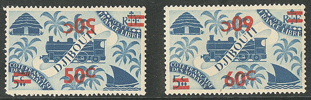 COTE FRANÇAISE DES SOMALIS. ** Double surcharge dont une renversée. Nos 254a, 255b. - TB (cote Yvert : 935€) (Image)