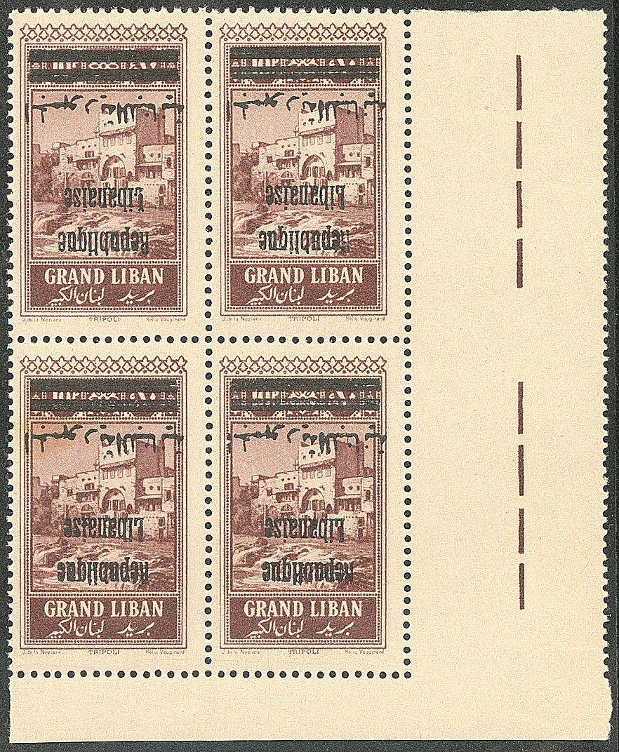 GRAND LIBAN. ** Surcharge renversée. No 108a, bloc de quatre cdf. - TB (cote Yvert : 1140€) (Image)