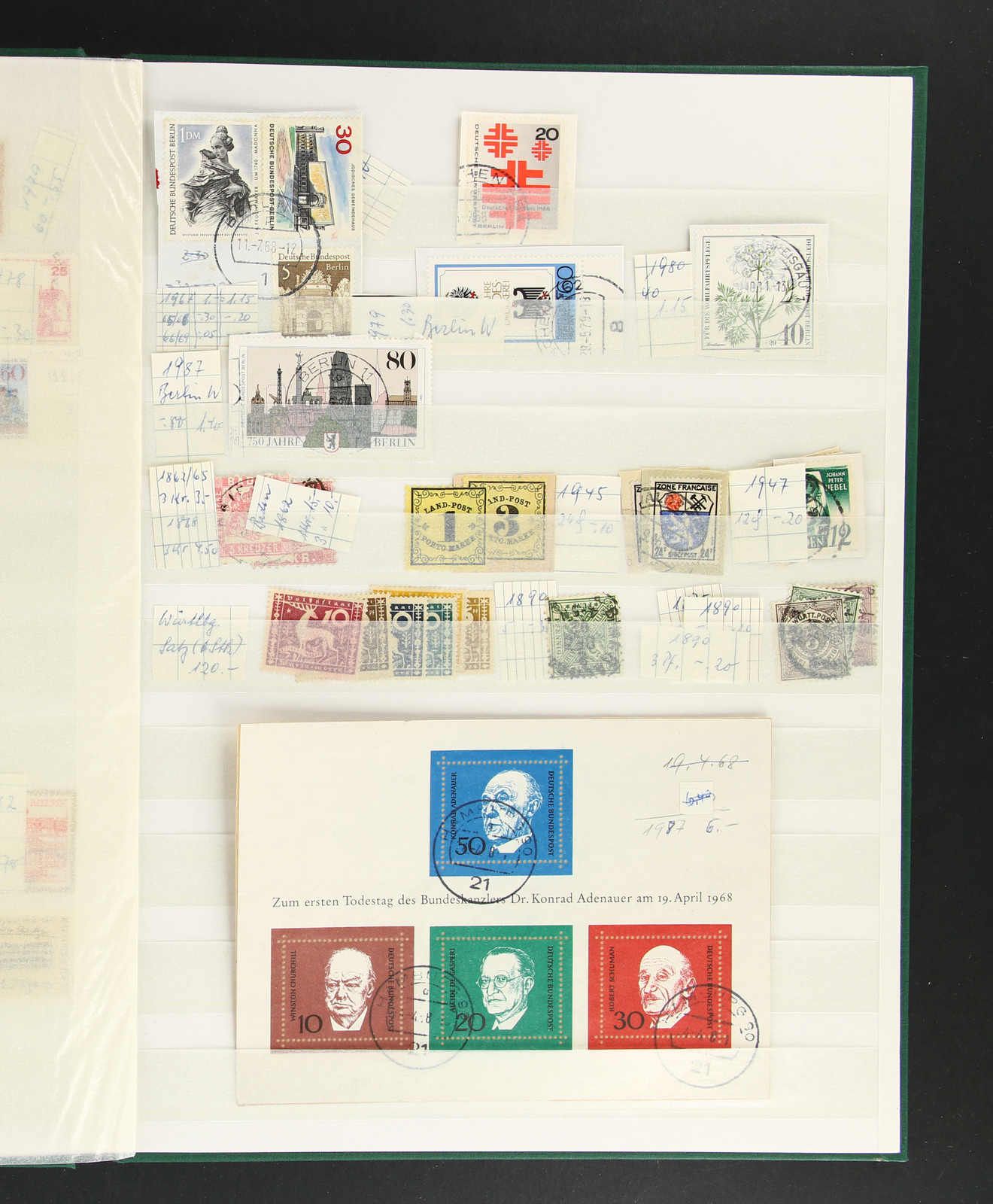 SAMMLERNACHLASS: 1850/2000 ca., Bestand in fünf Kartons in verschiedenen Erhaltungen, dabei Berlin mit besseren Ausgaben (Block 1 mit falschem Stempel!), Saar, Ausland, Deutsches Reich, alte Tütenware, Blätterposten und weiteres