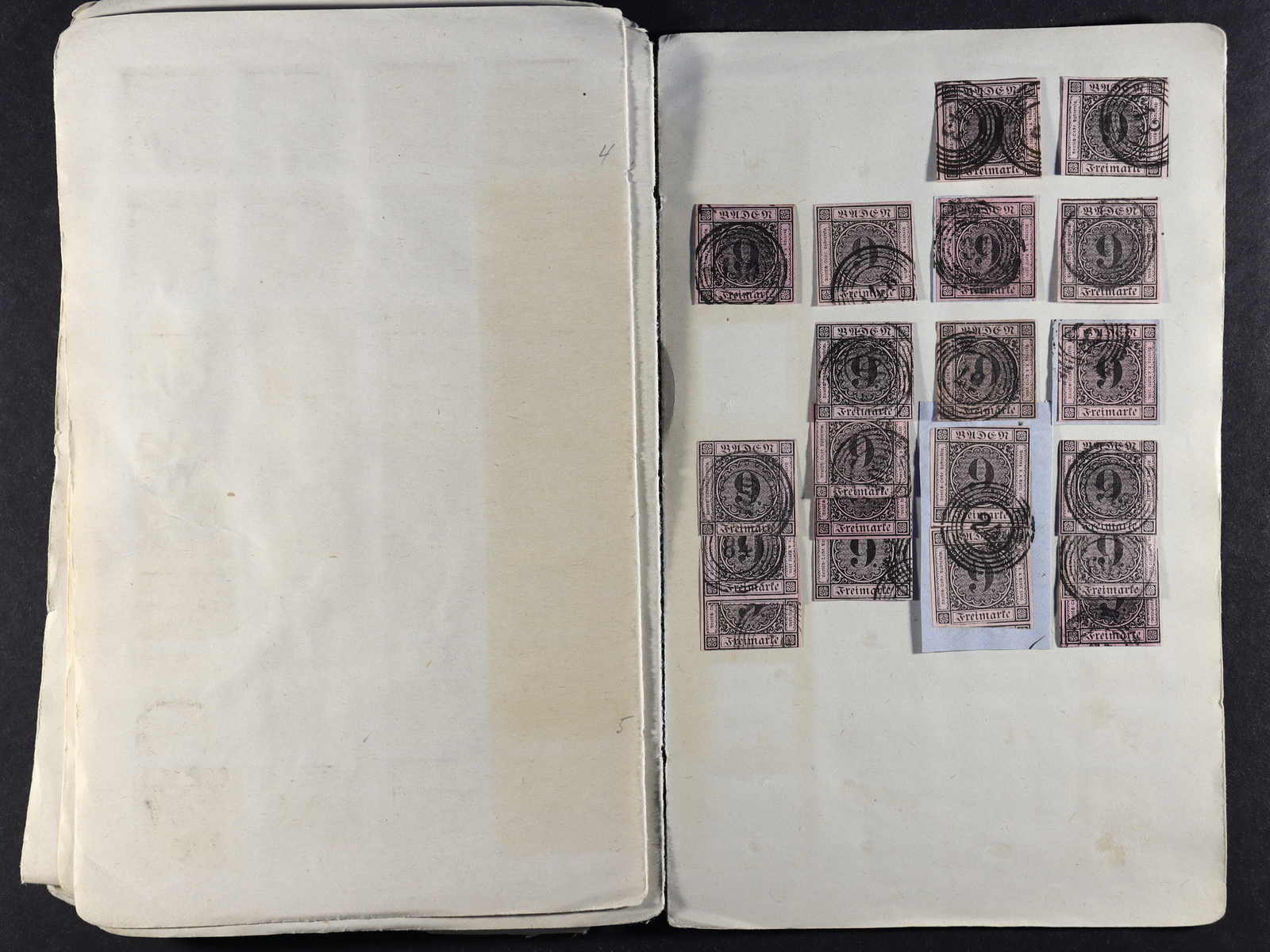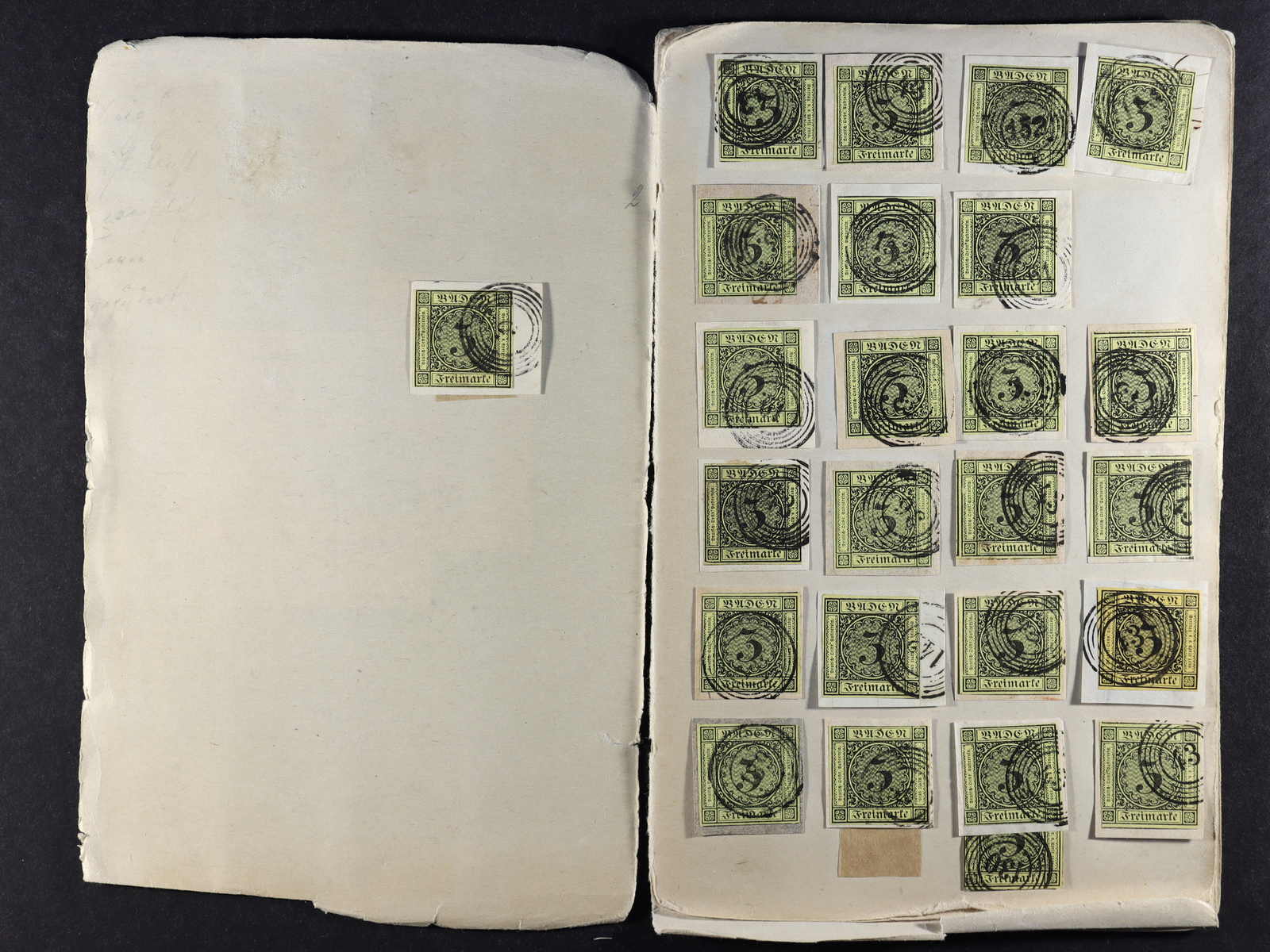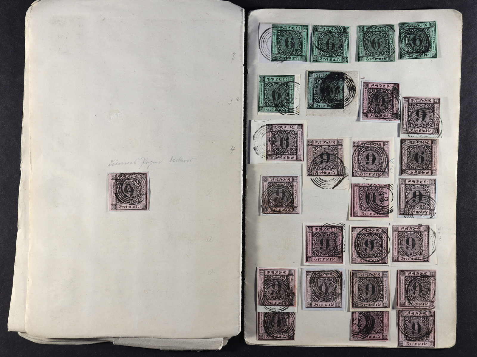 BADEN: 1851/52, umfangreicher Bestand, überwiegend auf kl. Briefst., auch etwas gest., der Mi-Nr. 2 bis 4, dabei 2 (90), 3 (16) und 4 (62), mit verschiedenen Nummerstp. entwertet, teils in unterschiedlichen Farben, alle farbfrisch