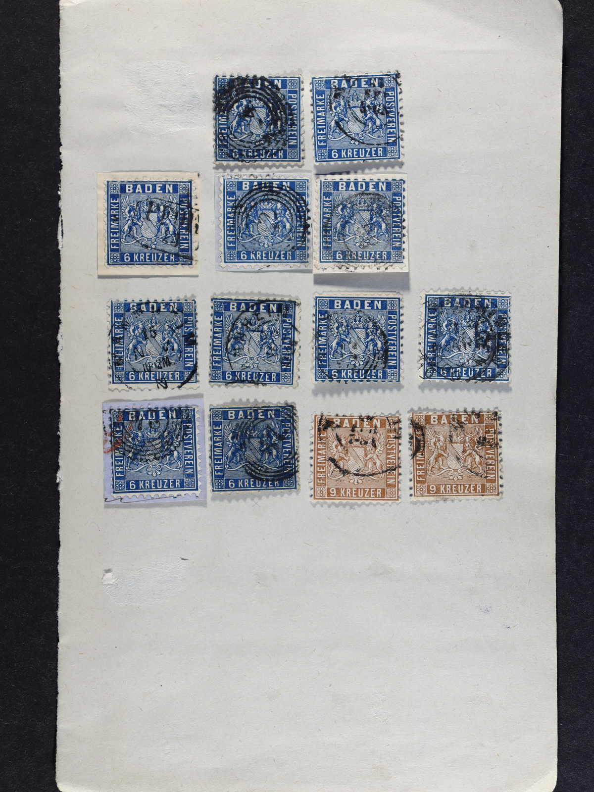 BADEN: 1860/63, umfangreicher Bestand, überwiegend auf kl. Briefst., auch etwas gest. aus Mi-Nr. 9 bis 15, dabei Nr. 9 (29), 10 (2), 11 (20), 14 (11) und 15 (2), mit verschiedenen Nummernstp. oder Ortsstp. entwertet, teils in