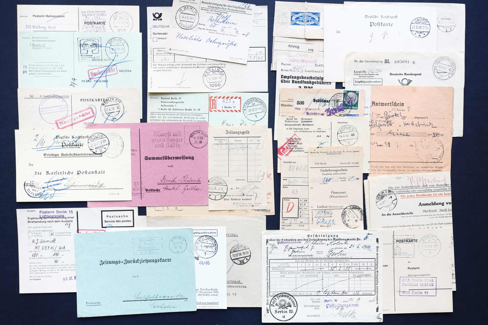 DEUTSCHLAND POSTFORMULARE: 1899/1971 ca., Zusammenstellung von 26 verschiedenen gebrauchten Postformularen, u.a. Zeitungsbestellung, Einlieferungsscheine, Rundfunkgenehmigungen, Nachportoeinziehungen, Gebührenquittung,