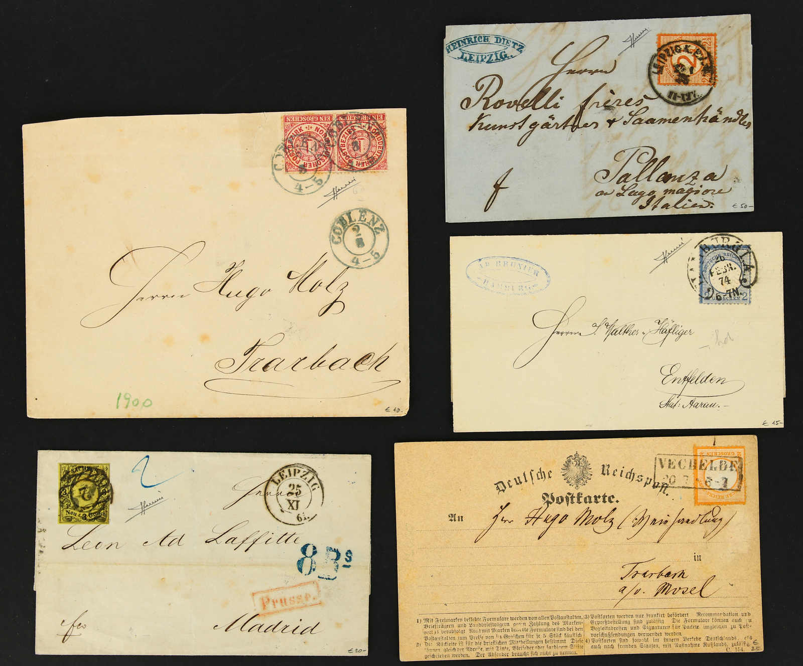ALTDEUTSCHLAND: 1861/75, sieben Belege Preußen, Sachsen, NDP und auch Deutsches Reich, dabei interessanter Beleg von Leipzig nach Madrid/Spanien, schöne Zusammenstellung (Image) (imagea)