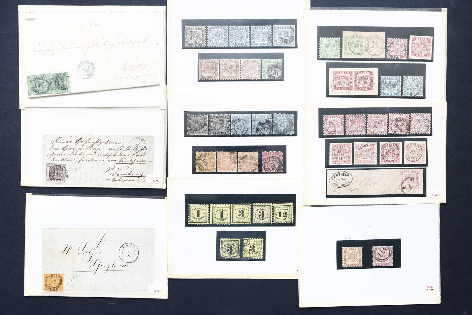 BADEN: 1851/68, gemischter Posten, überwiegend gest., etwas ungebr. und auf Briefen, ab Mi-Nr. 1/4 gest. gesammelt nach Farben und Abstempelungen, dazu Mi-Nr. 19, etwas Landpostporto in beiden Erhaltungen sowie einige frankierte