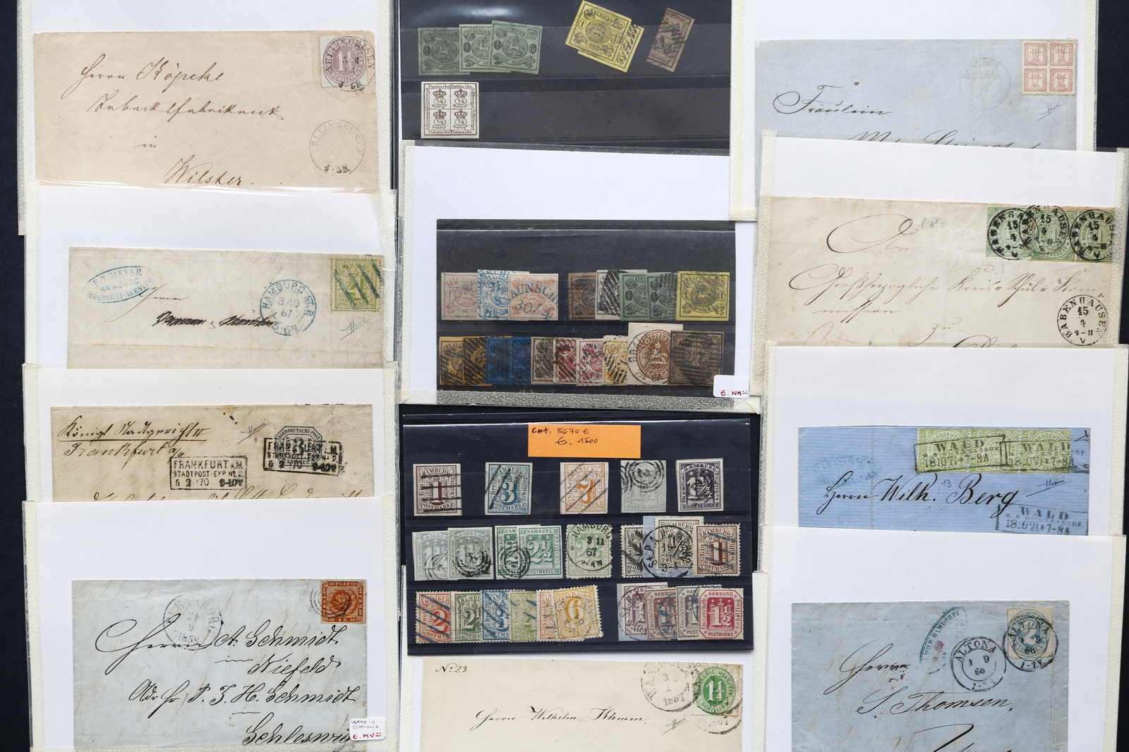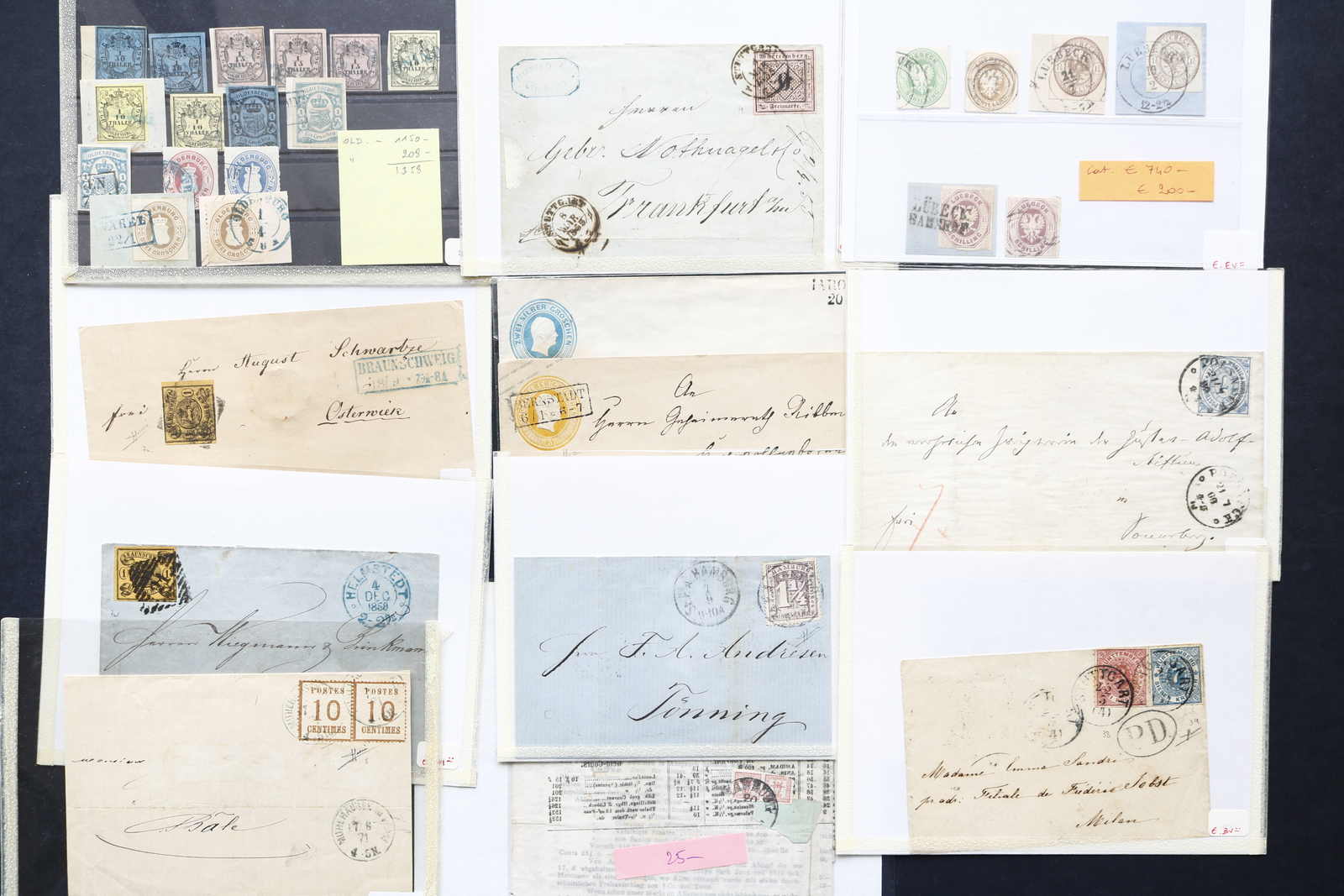 Hannover und Helgoland mit vielen Briefen/Ganzsachen, Oldenburg Mi-Nr. 2/4 mehrfach, 10 gest. und 12 in verschiedenen Farben, etwas Lübeck, Preußen, Sachsen ab Mi-Nr. 2, Schleswig-Holstein mit hübschen Briefen, Württemberg und NDP mit div.