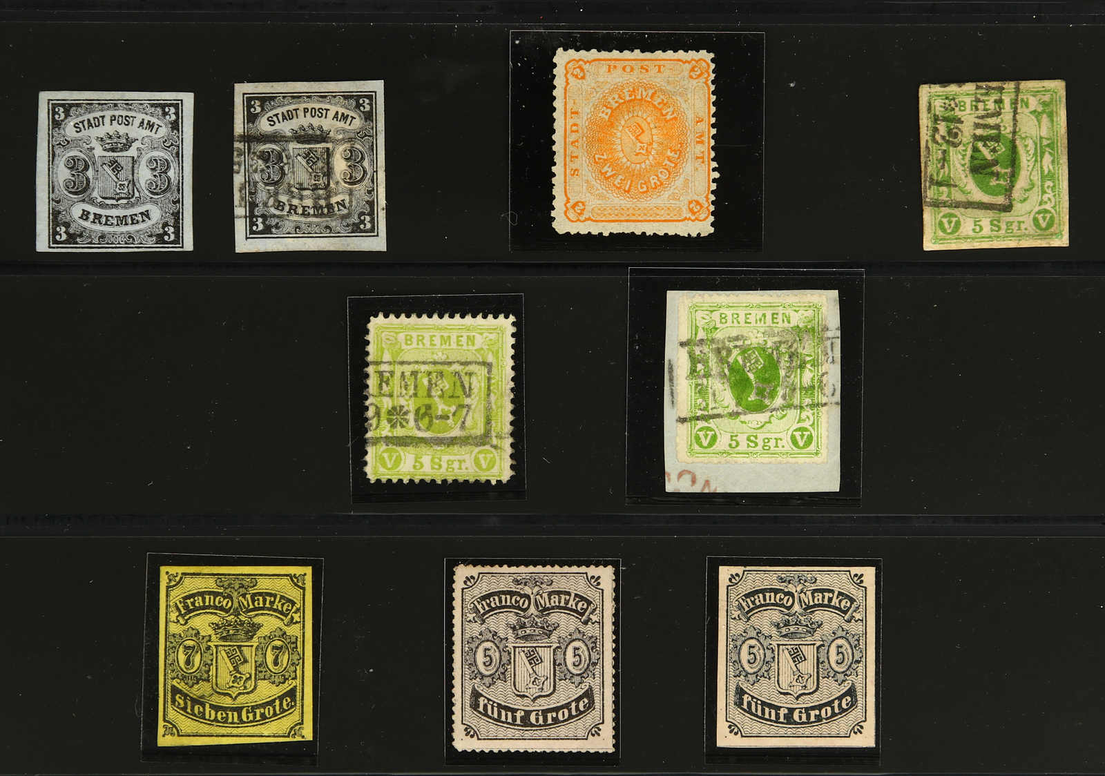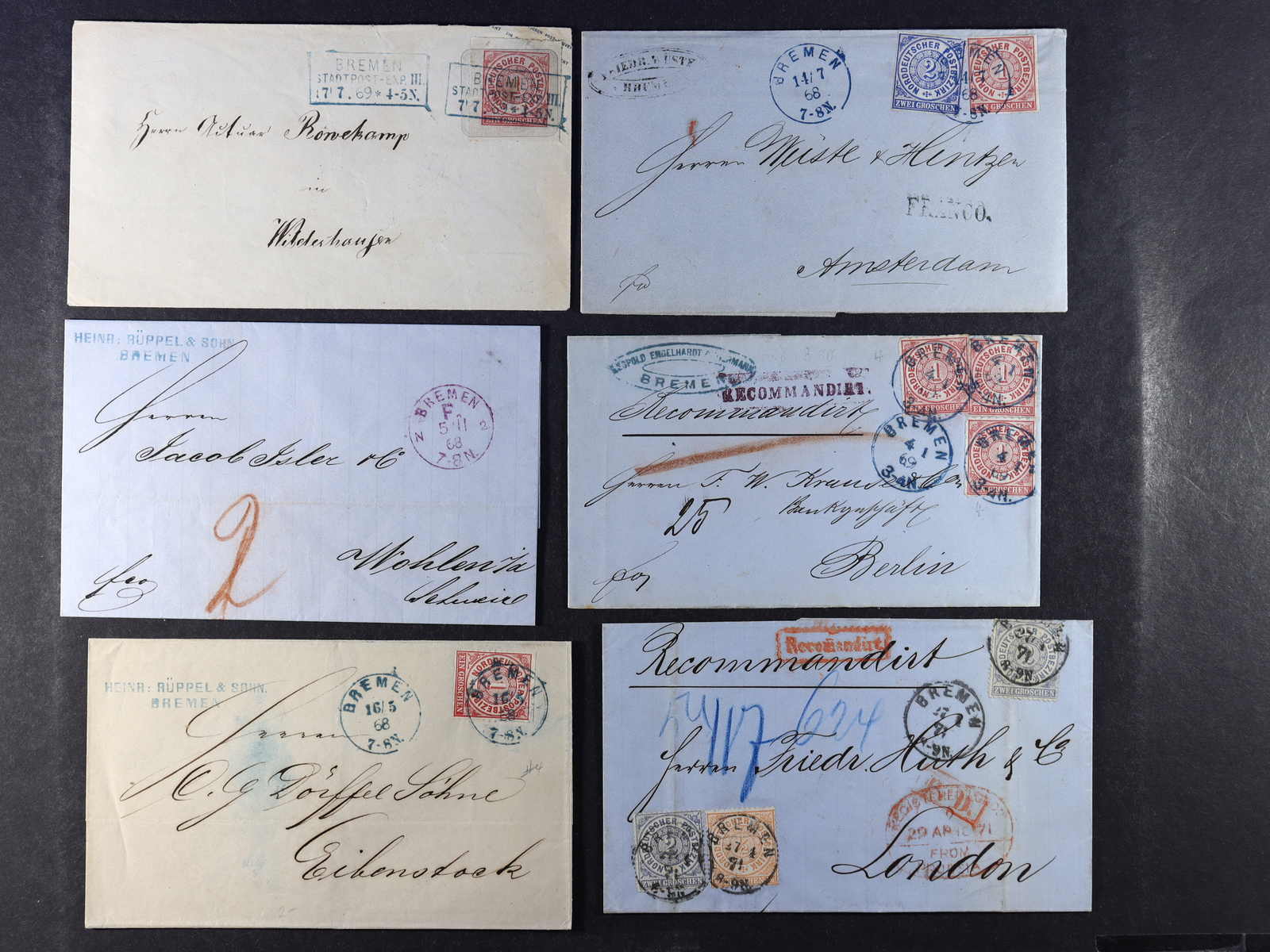BREMEN: 1868/71, Verwendungen zur NDP-Zeit, alte Partie mit 11 Belegen, meist besonders attraktive Erhaltung mit seltenen Stücken, u.a. eine in Bremen verwendete Oldenburg-Überdruck-Ganzsache (!), mehrere Auslandsbriefe etc. (Image) (imagea)