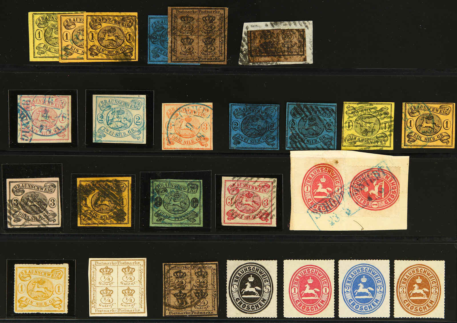 BRAUNSCHWEIG: 1852/67, interessanter und hochwertiger alter Bestand aus Leipziger Händler-Nachlass. Mit insgesamt über 180 Werten (teils in Einheiten) inkl. zahlreicher Briefstücke und vielen guten, seltenen Werten, schönen Marken