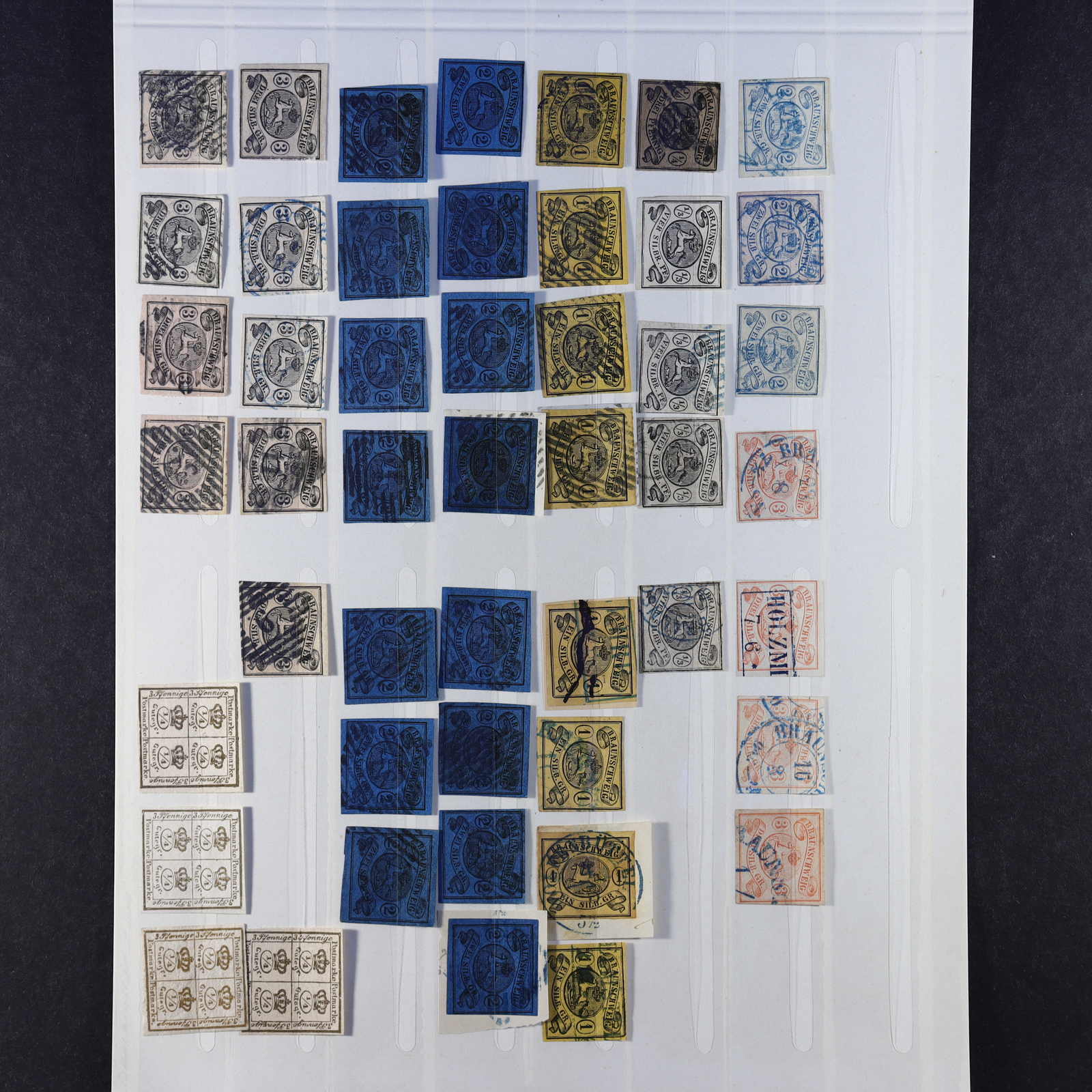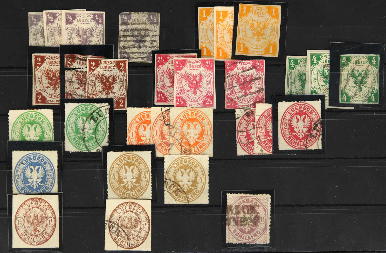 (!) und teils in Einheiten. Bestes Stück ist u.E. noch ein äußerst seltenes (und garantiert echtes und unbehandeltes) Rand-Paar (Rand-Nr. "6") der Mi-Nr. 20 mit idealen Stempeln "Harburg"! Zudem weitere gestempelte Einheiten, u.a. Dreierstreifen Nr.
