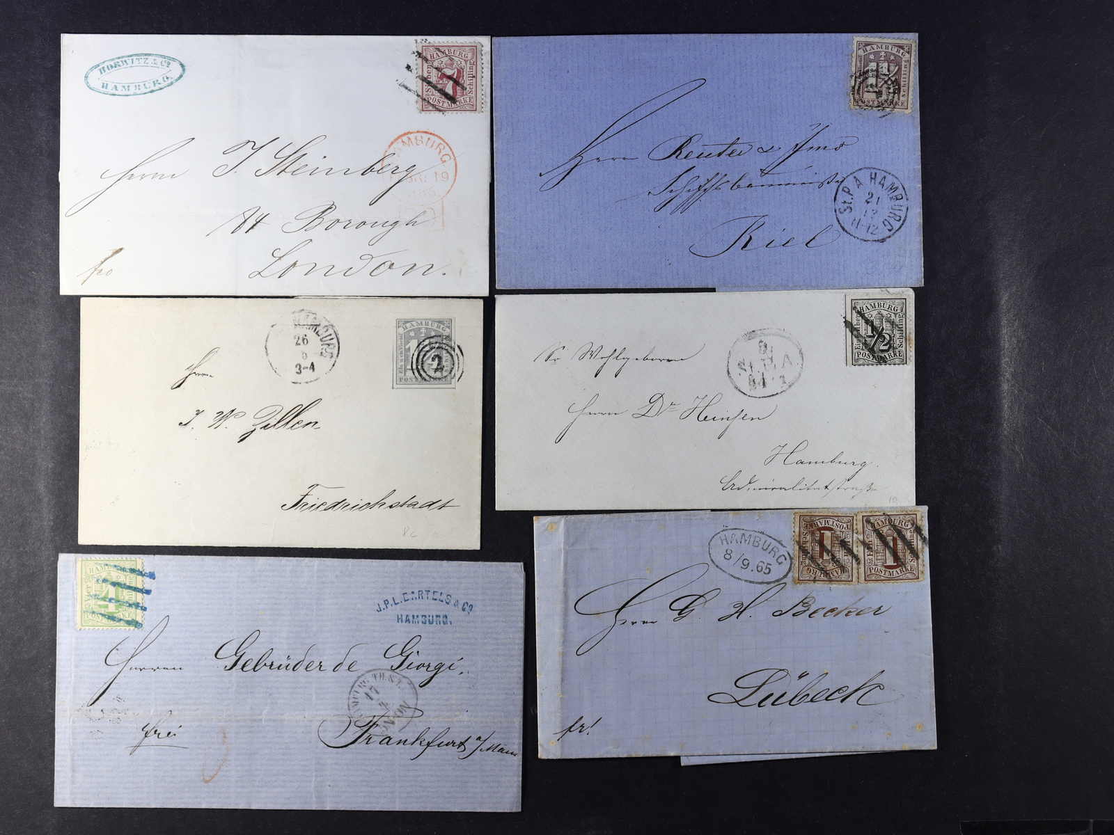 HAMBURG: 1865/67 ca., 9 frankierte Faltbriefe, Faltbriefhüllen sowie eine Drucksache, dabei 2 Belege ins Ausland, teils nicht mehr ganz komplett, meist gute Qualität (Image) (imagea)