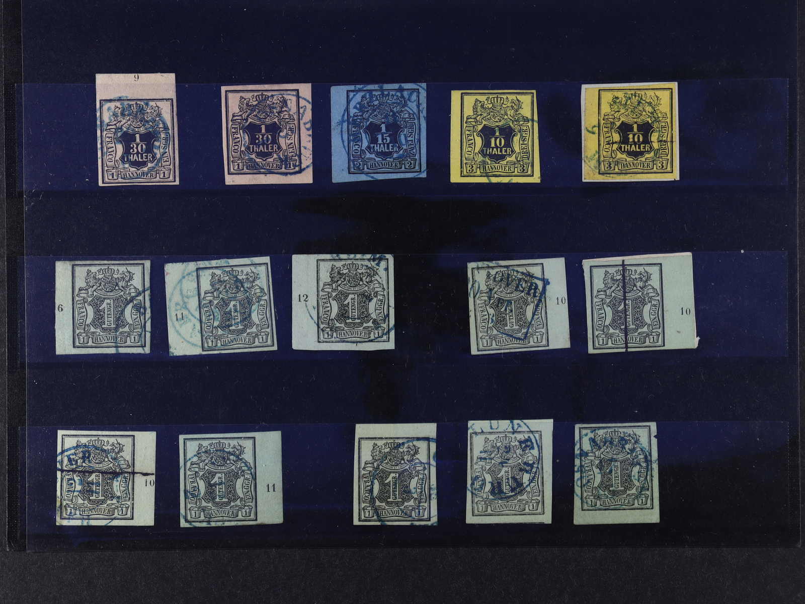 HANNOVER: 1850/64, gest. Sammlung, einige Werte auch auf Briefstück, in den Hauptnummern fast kpl., dabei Mi-Nr. 1 (2), 2 a (2), 2 b, 3 a/b (5), 7/12, 13 a, 14 a bis 14 IId, 15/16,17 y, 19 a und 21/25, bei einigen Ausgaben mit
