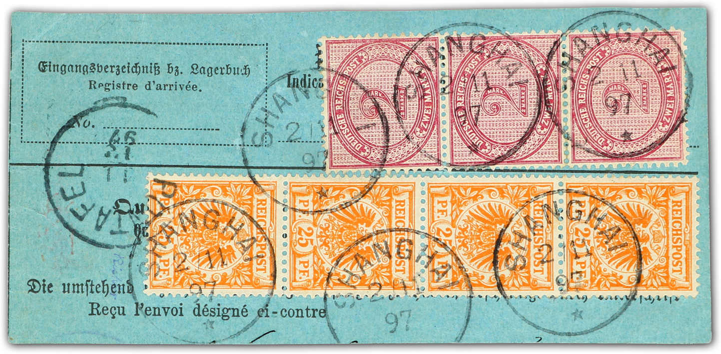 1897, 2 M. Innendienst im senkrechten 3er-Streifen zusammen mit Krone/Adler 25 Pfg. gelblichorange im senkrechten 4er-Streifen auf Paketkartenausschnitt, entwertet mit Ekr. "SHANGHAI 2. 11. 97", farbfrisch und meist gut gezähnt,