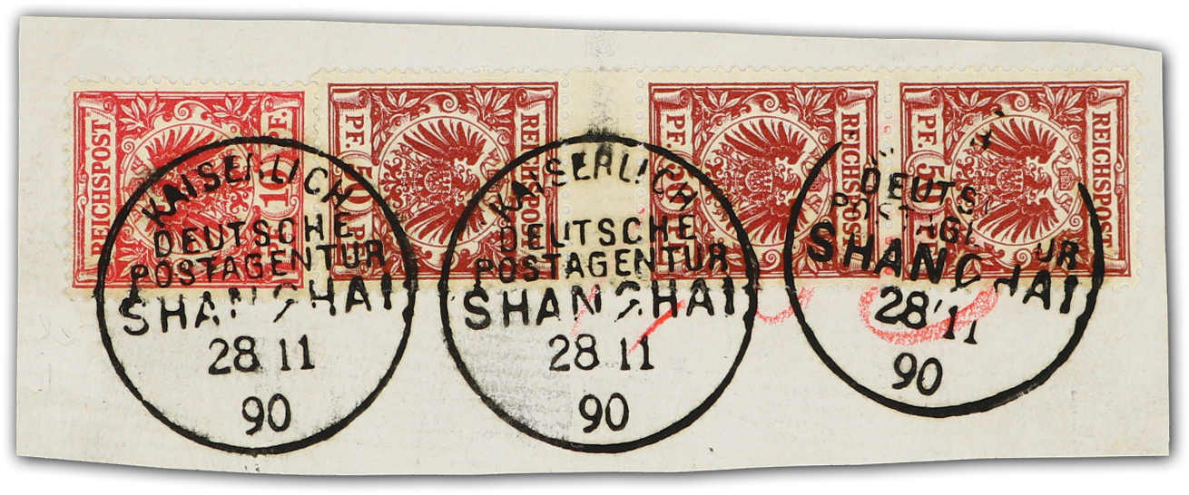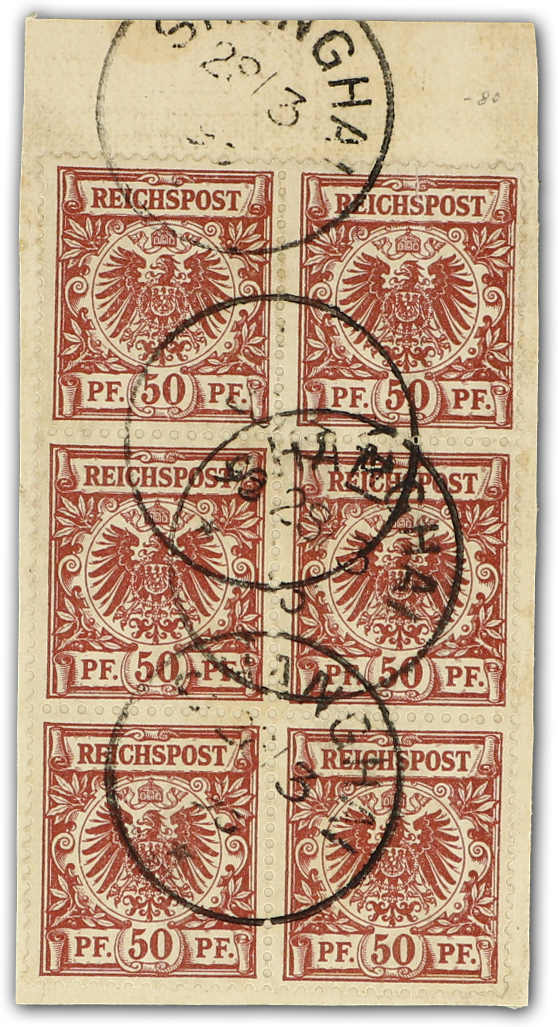 1895, 50 Pfg. Krone/Adler mittelbraunrot im 6er-Block auf Briefstück, entwertet mit vier Abschlägen des kleinen Einkreisstempels "SHANGHAI 25.3.95", farbfrisch, der obere rechte Wert mit Einriss oben, sonst gute Qualität, sign. Dr. Steuer