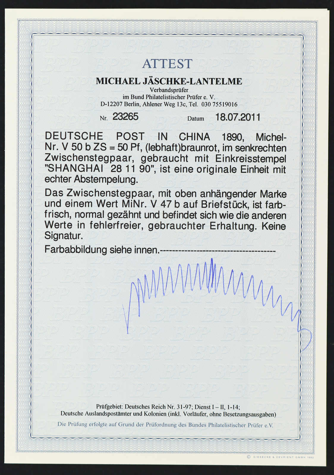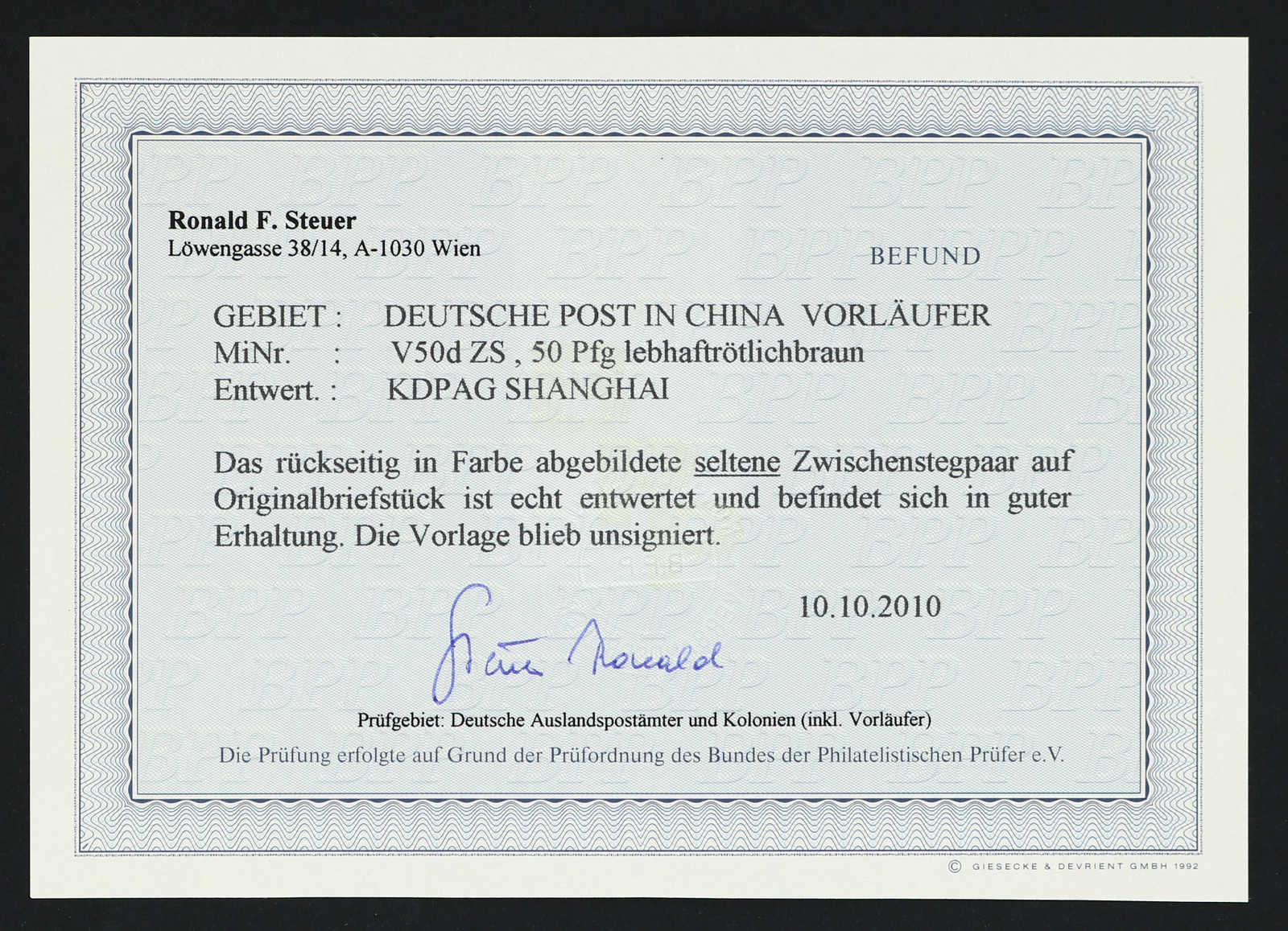 1890, 50 Pfg. Krone/Adler (lebhaft)braunrot, senkrechtes Zwischenstegpaar mit weiterer anhängender Marke oben sowie 10 Pfg. lebhaftrosarot auf Briefstück, glasklar entwertet "SHANGHAI 28 11 90", farbfrisch und einwandfrei, Fotoattest