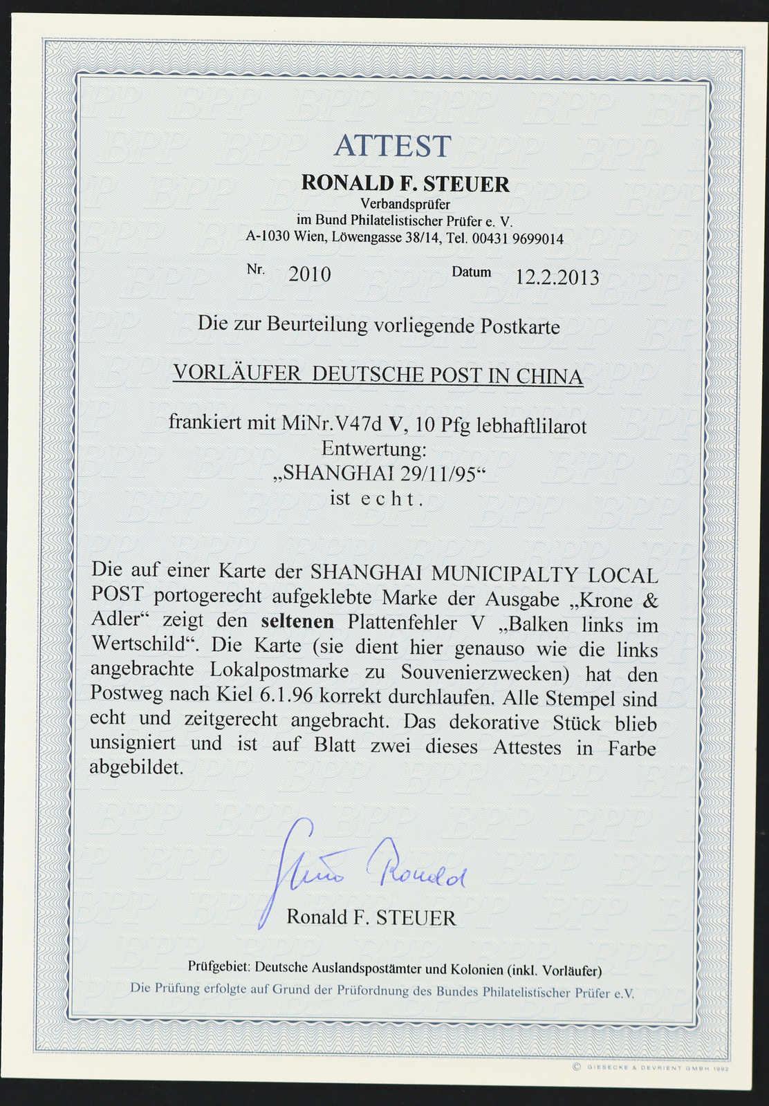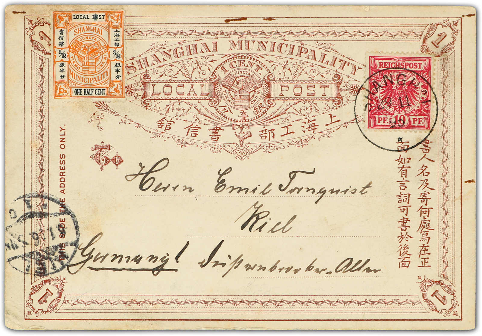1895, 10 Pfg. Krone/Adler lebhaftlilarot portogerecht auf Karte der SHANGHAI MUNICIPALITY LOCAL POST mit beigeklebter Lokalpostmarke (nicht entwertet), klar entwertet "SHANGHAI 29 11 95", mit seltenem Plattenfehler "Balken links im