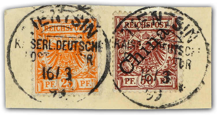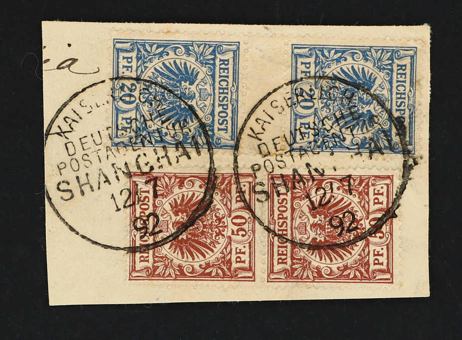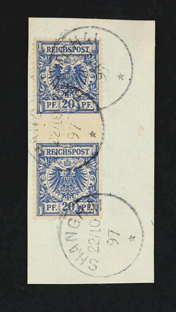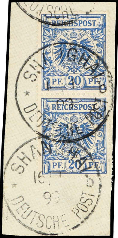 1899, 20 Pfg. Krone/Adler mittelblau im senkrechten Paar auf kl. Briefstück, entwertet mit zwei klaren Abschlägen "SHANGHAI DEUTSCHE POST -b- 16/1 99", farbfrisch und gut gezähnt, eine seltene Spätverwendung dieser Marke, einwandfrei,