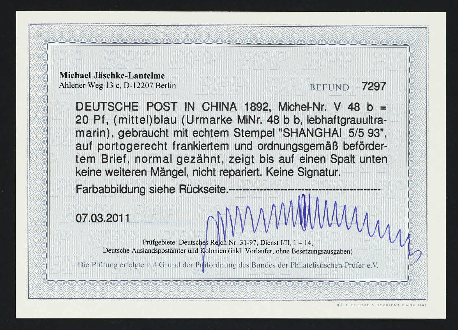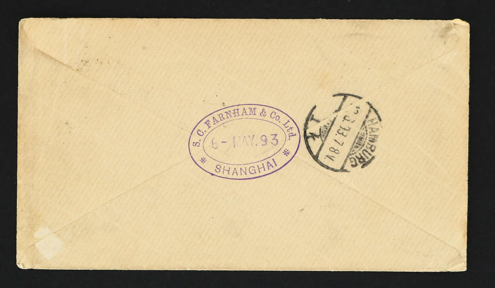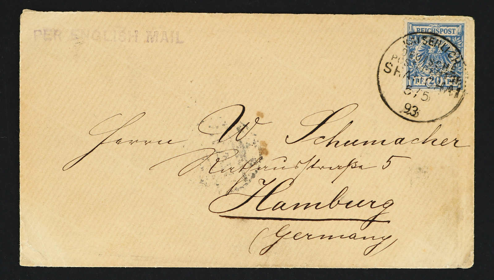 1892, 20 Pfg. Krone/Adler (mittel)blau (Urmarke 48 bb lebhaftgrauulramarin), portogerecht auf ordnungsgemäß befördertem Brief mit deutlicher Entwertung "SHANGHAI 5/5 93", Spalt unten, Fotobefund Jäschke-Lantelme BPP (Image) (imagea)