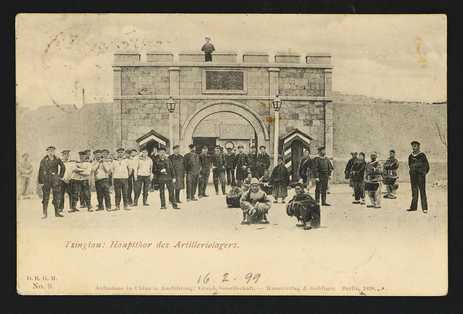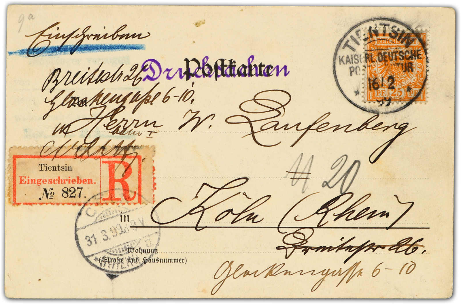 1899, 25 Pfg. Krone/Adler gelblichorange, portogerechte Einzelfrankatur auf eingeschriebener Drucksache (Ansichtskarte Tsingtau, Haupttor des Artillerielagers) ohne sonstige Mitteilung, aufgegeben "TIENTSIN KAISERL. DEUTSCHE POSTAGENTUR