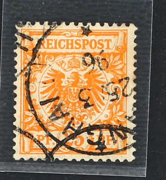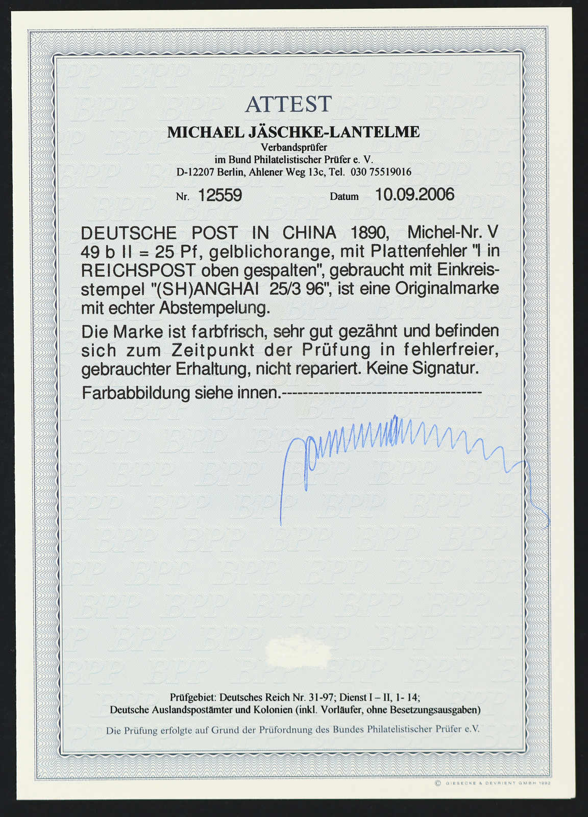 1890, 25 Pfg. Krone/Adler gelblichorange mit Plattenfehler "I in REICHSPOST oben gespalten", gestempelt "(SH)ANGHAI 25/3 96", farbfrisch und einwandfrei, Fotoattest Jäschke-Lantelme BPP (ME 500,-) (Image) (imagea)