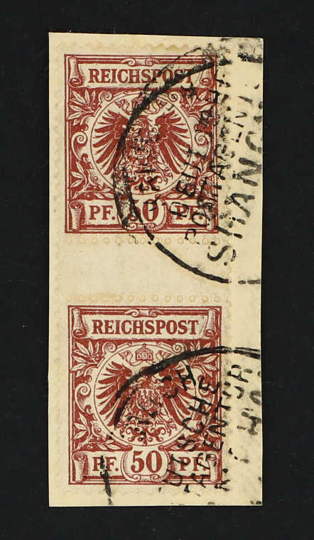 1891/98, 50 Pfg. Krone/Adler lebhaftrötlichbraun, senkrechtes Zwischenstegpaar auf Briefstück, gestempelt "SHANGHAI", gute Qualität, Fotobefund Steuer BPP