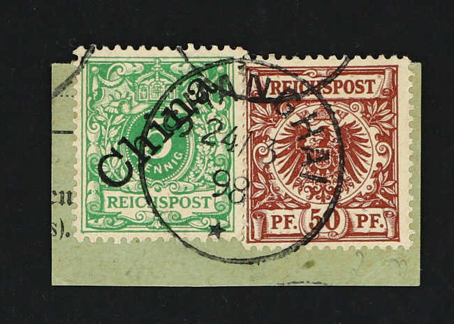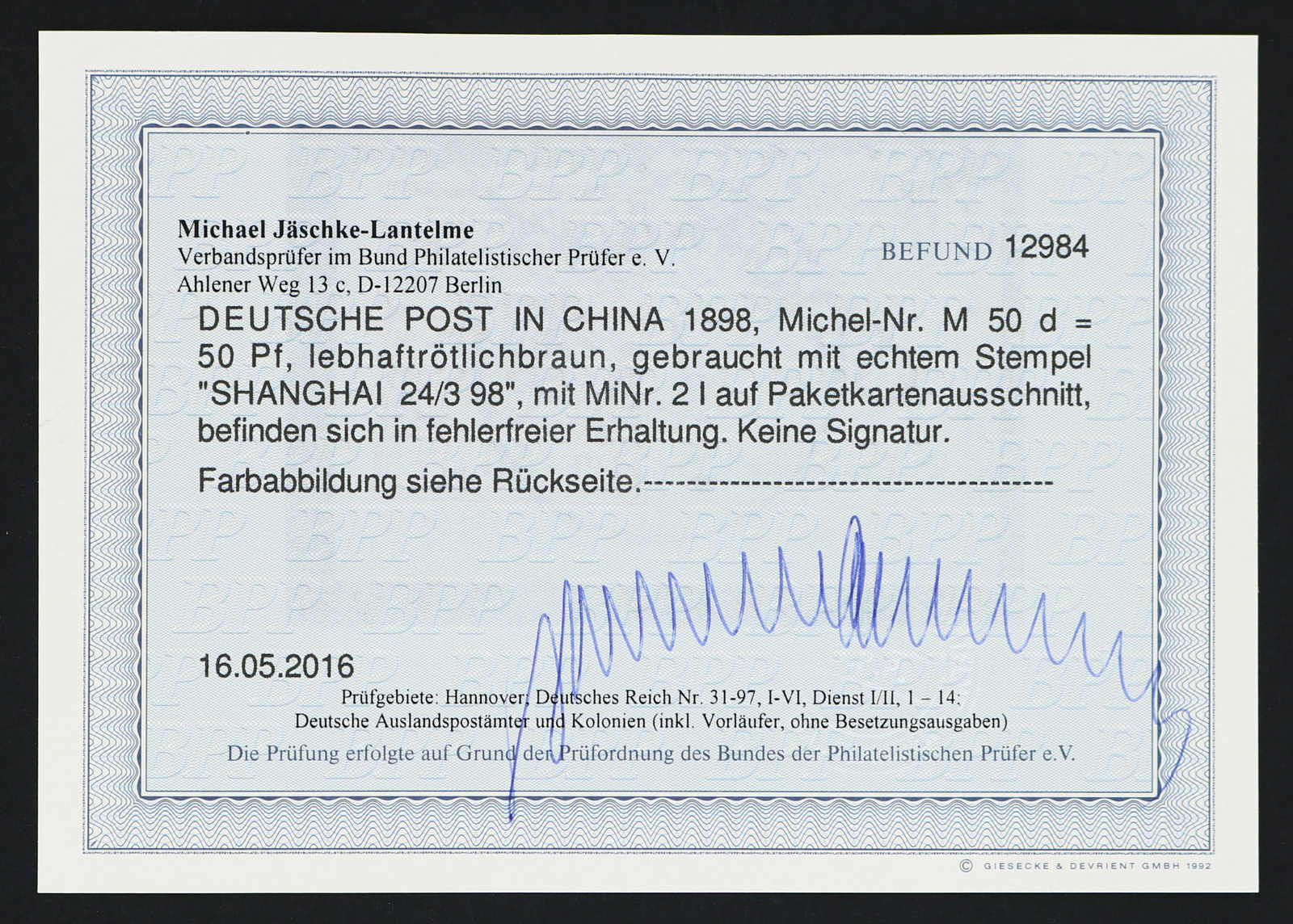 1898, 50 Pfg. Krone/Adler lebhaftrötlichbraun zusammen mit 5 Pfg. Aufdruckausgabe auf Paketkartenabschnitt mit klarer Entwertung "SHANGHAI 24/3 98", einwandfrei, Fotobefund Jäschke-Lantelme BPP (ME 450,-) (Image) (imagea)