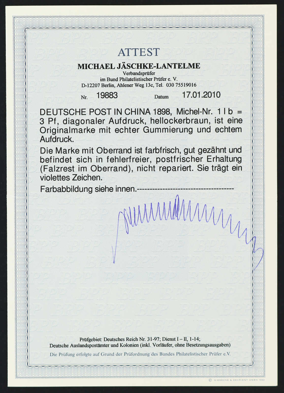 1898, 3 Pfg. diagonaler Aufdruck hellockerbraun, postfrisches Exemplar mit oben anhängendem Oberrand (dort Falzrest), einwandfrei, signiert, Fotoattest Jäschke-Lantelme BPP (ME 500,-) (Image) (imagea)