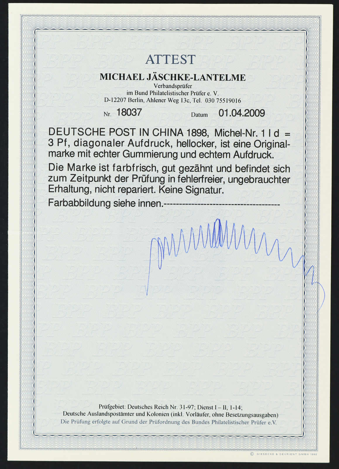 1898, 3 Pfg. diagonaler Aufdruck hellocker, ungebraucht, einwandfrei und farbfrisch, unsigniert, Fotoattest Jäschke-Lantelme BPP (ME 800,-)