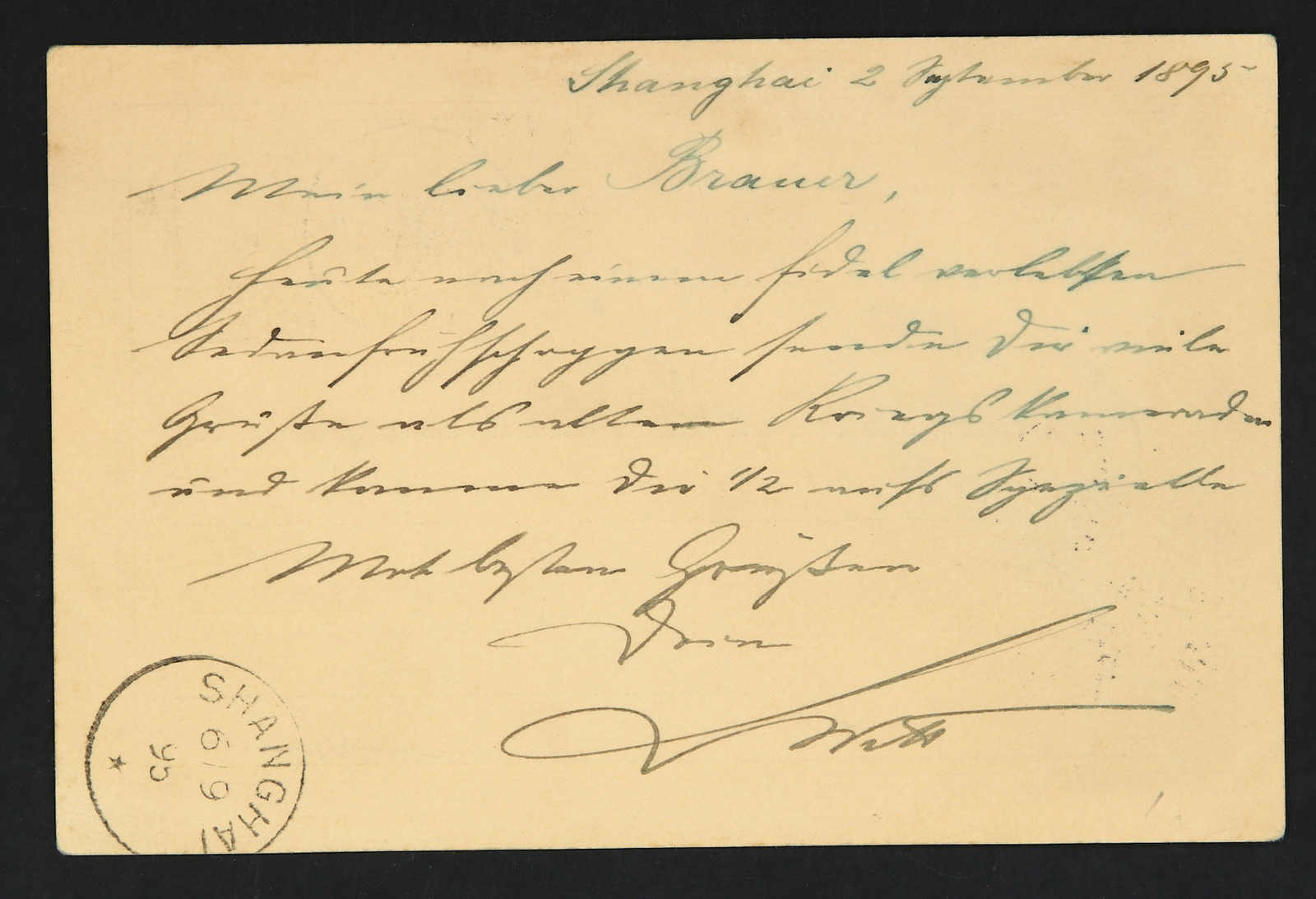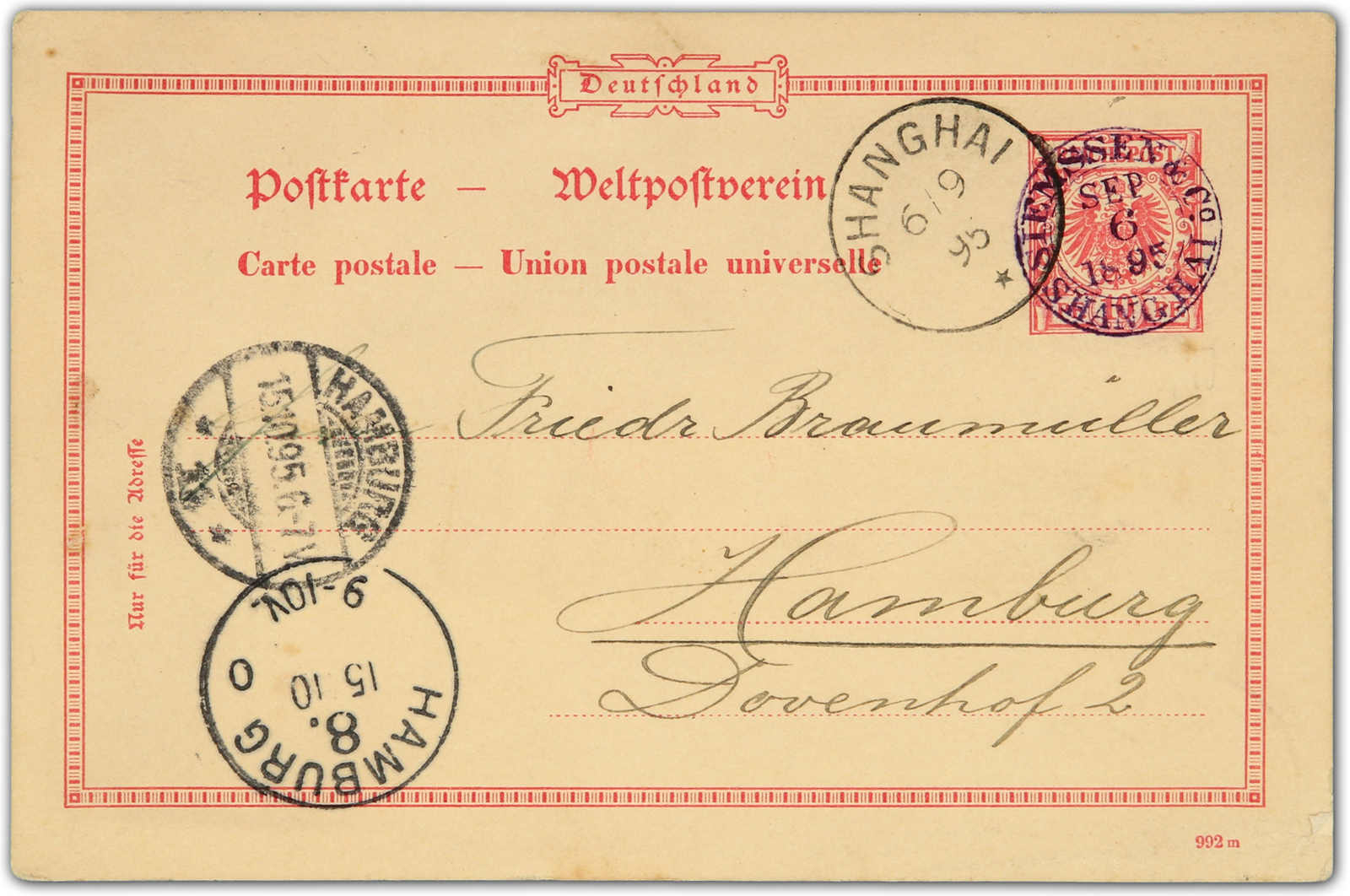 1895, 10 Pfg. Ganzsachen-Postkarte Krone/Adler (VP 25), entwertet mit kl. violetten Firmenstp. "SIEMSSEN & Co. SHANGHAI SEP. 6. 1895", seltene Sicherheitsentwertung mit nebengesetztem Poststp. "SHANGHAI 6 / 9 1895", adressiert nach