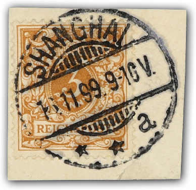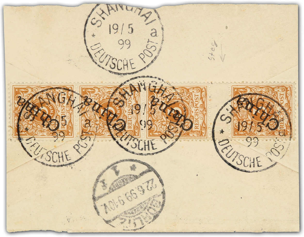 1899, 3 Pfg. Krone/Adler, hellockerbraun auf kleinem Briefst. entwertet mit "SHANGHAI ** a 16.11.99" (Schweizer Stempeltype), eine sehr seltene Entwertung auf diesem Wert, gute Qualität, sign. Bothe BPP und Fotoattest Roland Steuer BPP