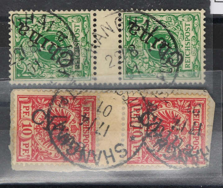 1898, 3 Pfg. lebhaftbraun, 5 Pfg. opalgrün und 10 Pfg. lebhaftlilarot, je mit steilem Aufdruck "China" als gest. Zwischenstegpaar, dabei das Paar zu 3 Pfg. mit 2 anhängenden Einzelwerten auf Briefst. sign. Jäschke-Lantelme BPP, das Paar