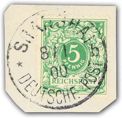 1900, 5 Pfg. Krone/Adler opalgrün mit dem seltenen Plattenfehler "unterer Bogen des zweiten S in REICHSPOST breit gebrochen", als Mitläufer entwertet "SHANGHAI DEUTSCHE POST 8.1.00", auf kleinem Briefst, farbfrisch und gut gezähnt, sign.