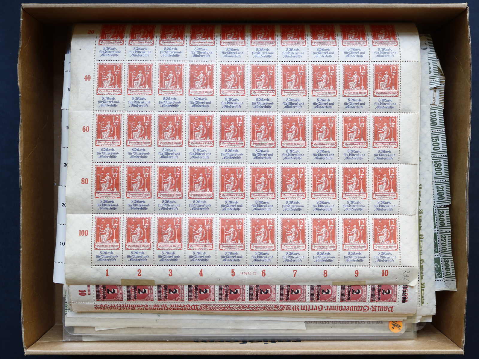 3167 nh imageDEUTSCHES REICH: 1921/23, umfangreicher postfr. Posten Bögen und einige Bogenteile, überwiegend as der Infla-Zeit, einige Bögen vorgefaltet, dabei auch etwas an OPD-Drucken, vieles mehrfach vorhanden, viel Material, überwiegend gute Qualität (Image)